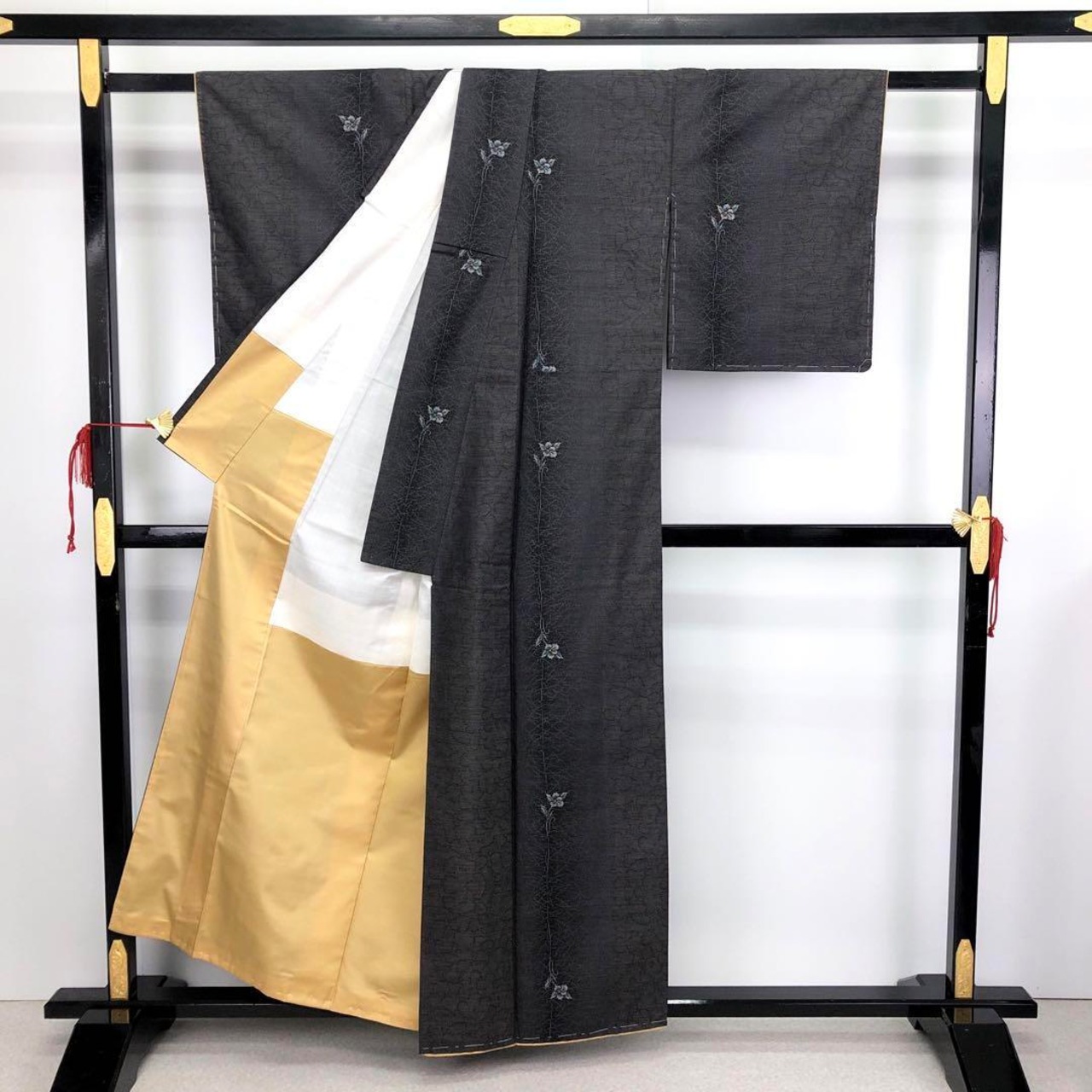 風合いの良い上品な茶泥染に縦柄にデザインされた上品な花模様が素敵なお品でございます。