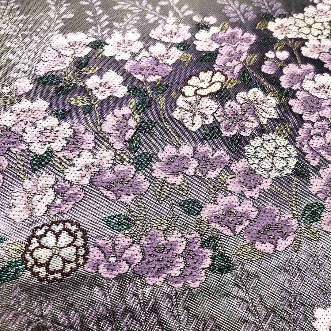 煌びやかな銀色に鮮やかな紫色ベースの小花模様がデザインされた素敵なお品でございます。