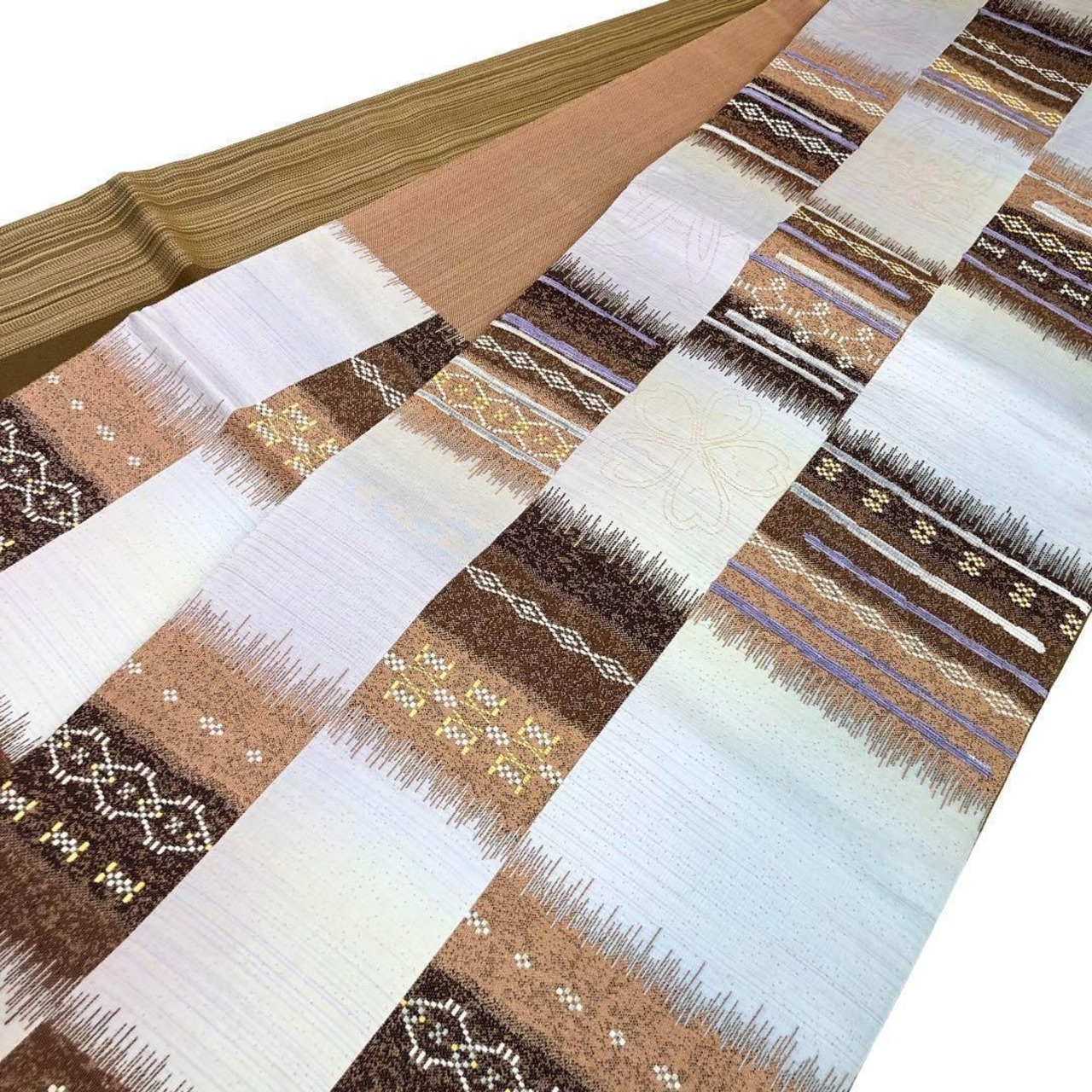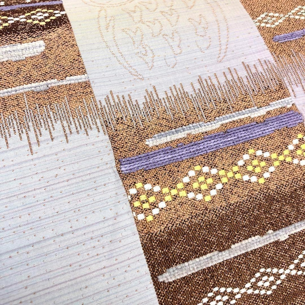 ミミズクや葡萄の柄裄がうっすらと浮かび上がり、格子に横柄の花織がデザインされた素敵なお品でございます。