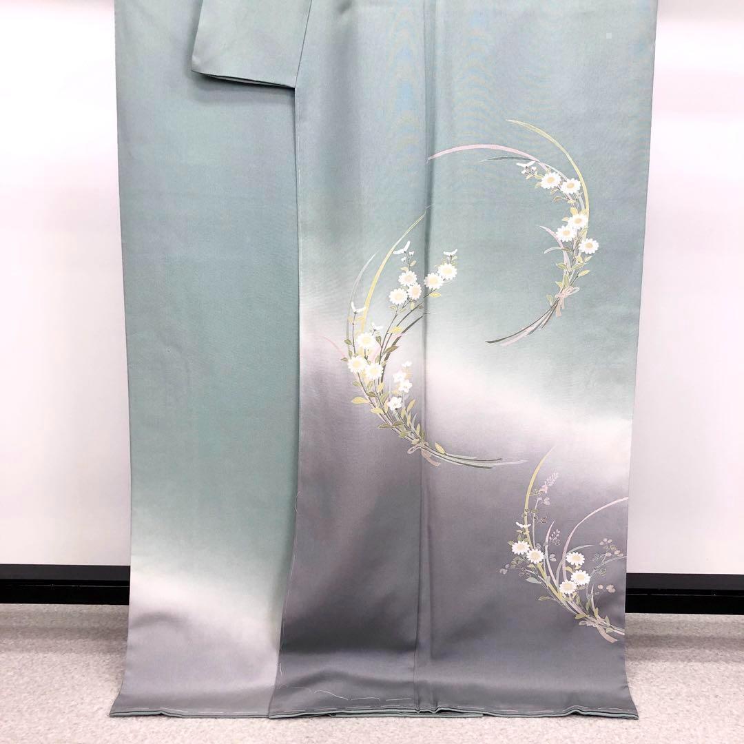 上品な淡青緑色に同系色のカラー胴裏、上品な花草模様に淡い暈しのお色でデザインされた素敵なお品でございます。