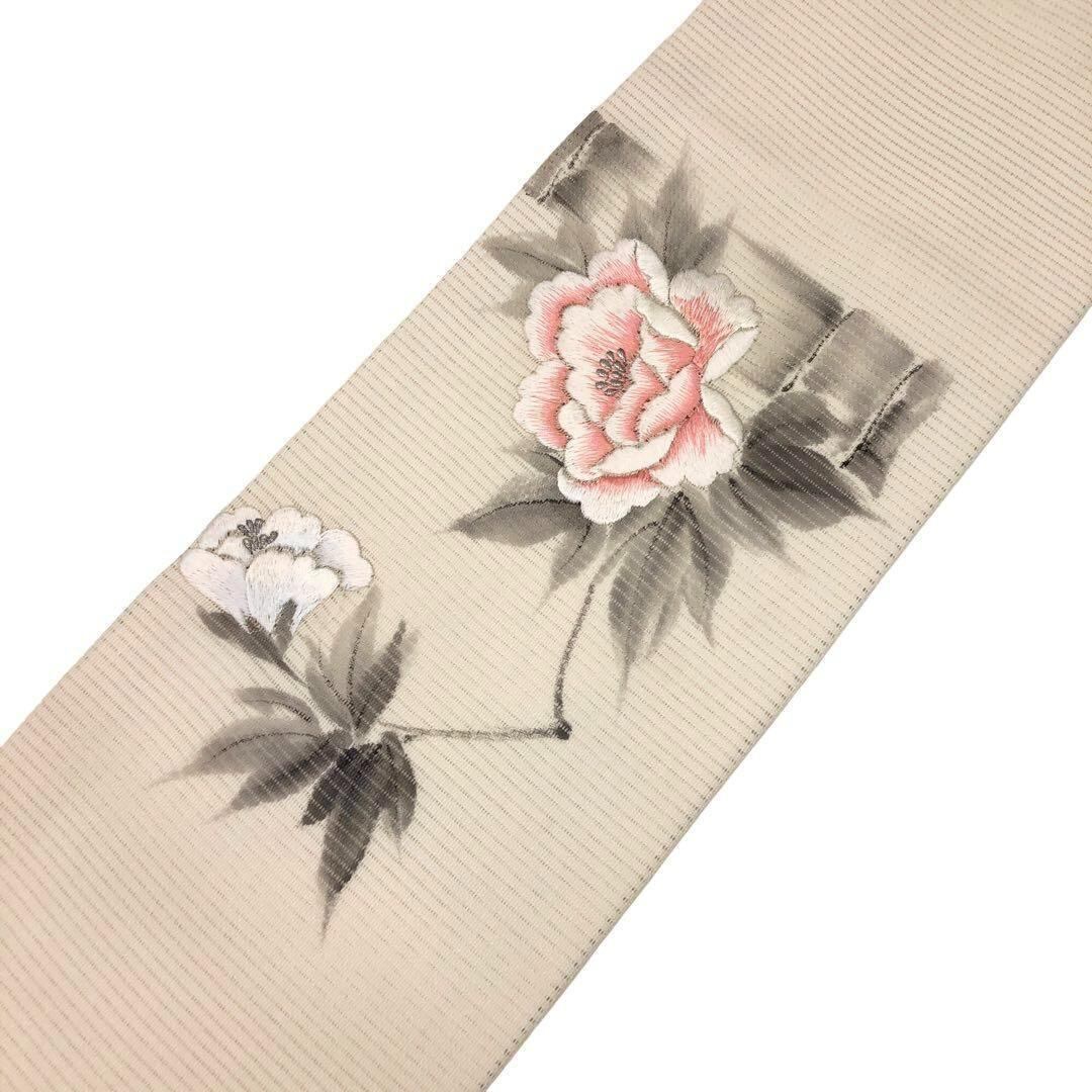 夏帯 名古屋帯 絽 美しい牡丹の花柄 刺繍 生成色 O-2785 着物 きもの kimono 和服 和装 中古 リサイクル着物 【送料無料】
