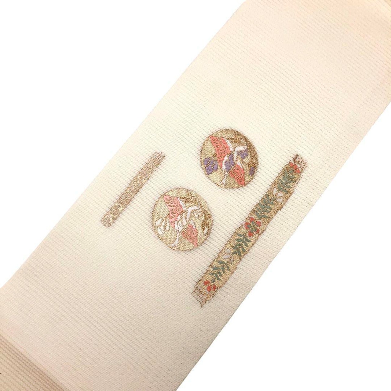 夏帯 名古屋帯 絽綴れ 丸に鳳凰 花唐草 金糸 乳白色 O-2871