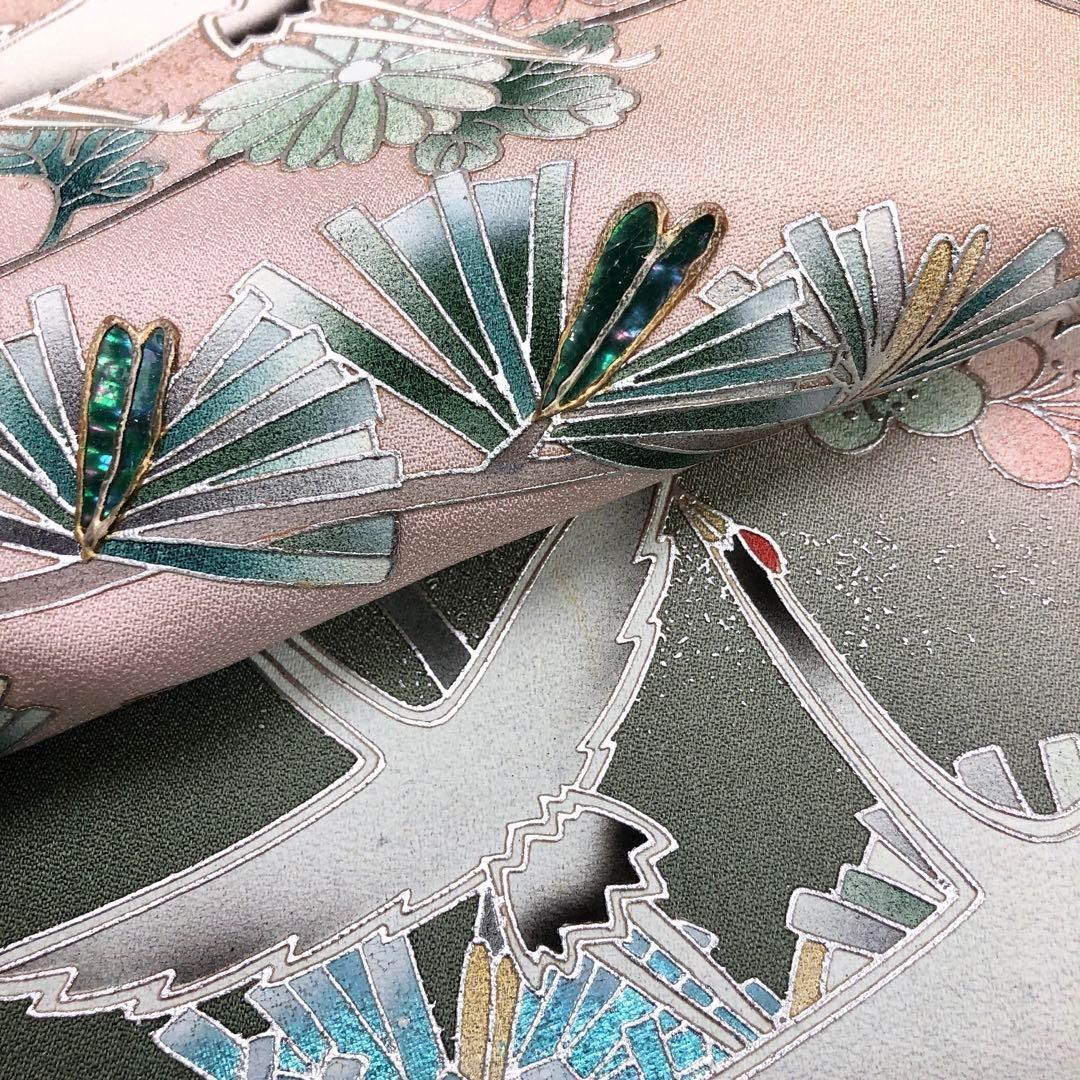 訪問着 金彩螺鈿 鶴 松の木 菊 梅 薄橙色 ガード加工 K-3160