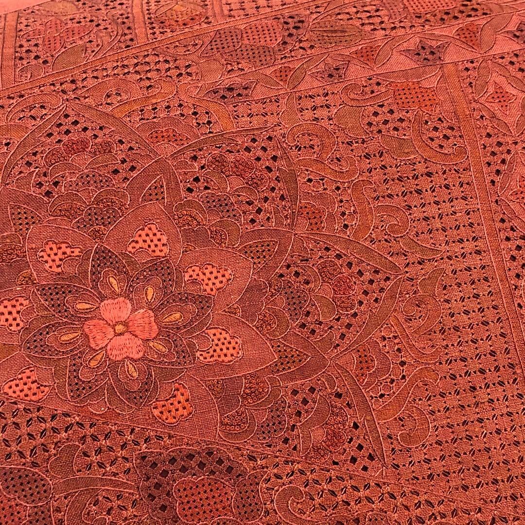 紅樺色の鮮やかな赤色に総刺繍でデザインされた華模様が素敵なお品でございます。