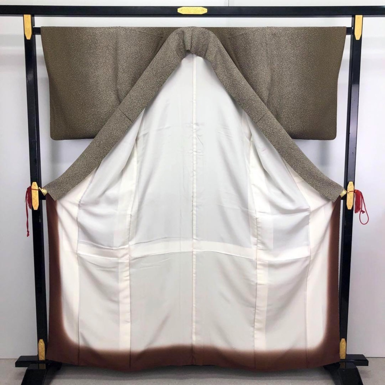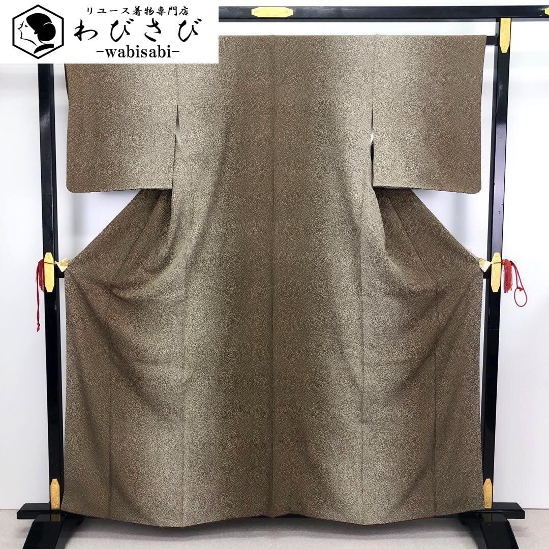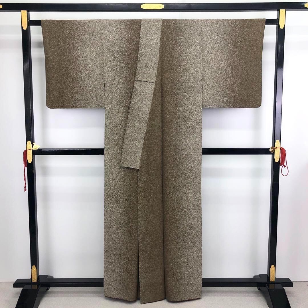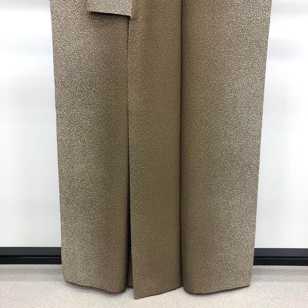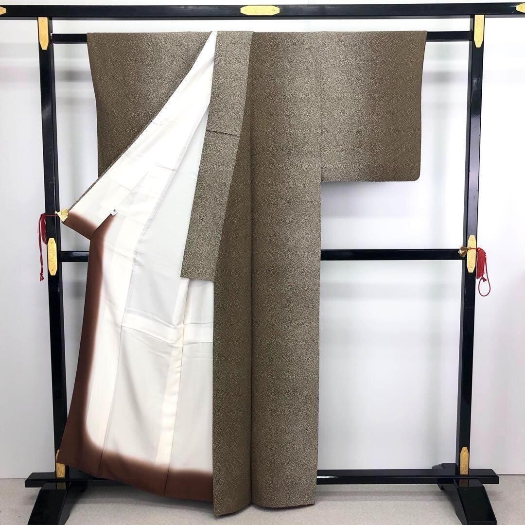 海松茶色の落ち着きのあるお色味に叩き染、縦柄のグラデーションが美しい素敵なお品でございます。