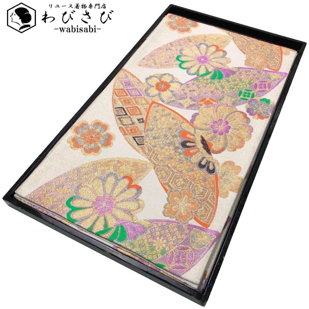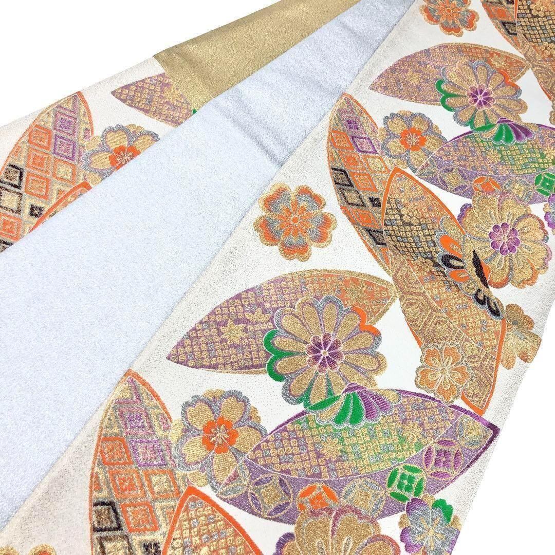 袋帯 花七宝 花菱 桜 菊 花亀甲 乳白色 振袖 O-2907 着物 きもの kimono 和服 和装 中古 リサイクル着物 【送料無料】