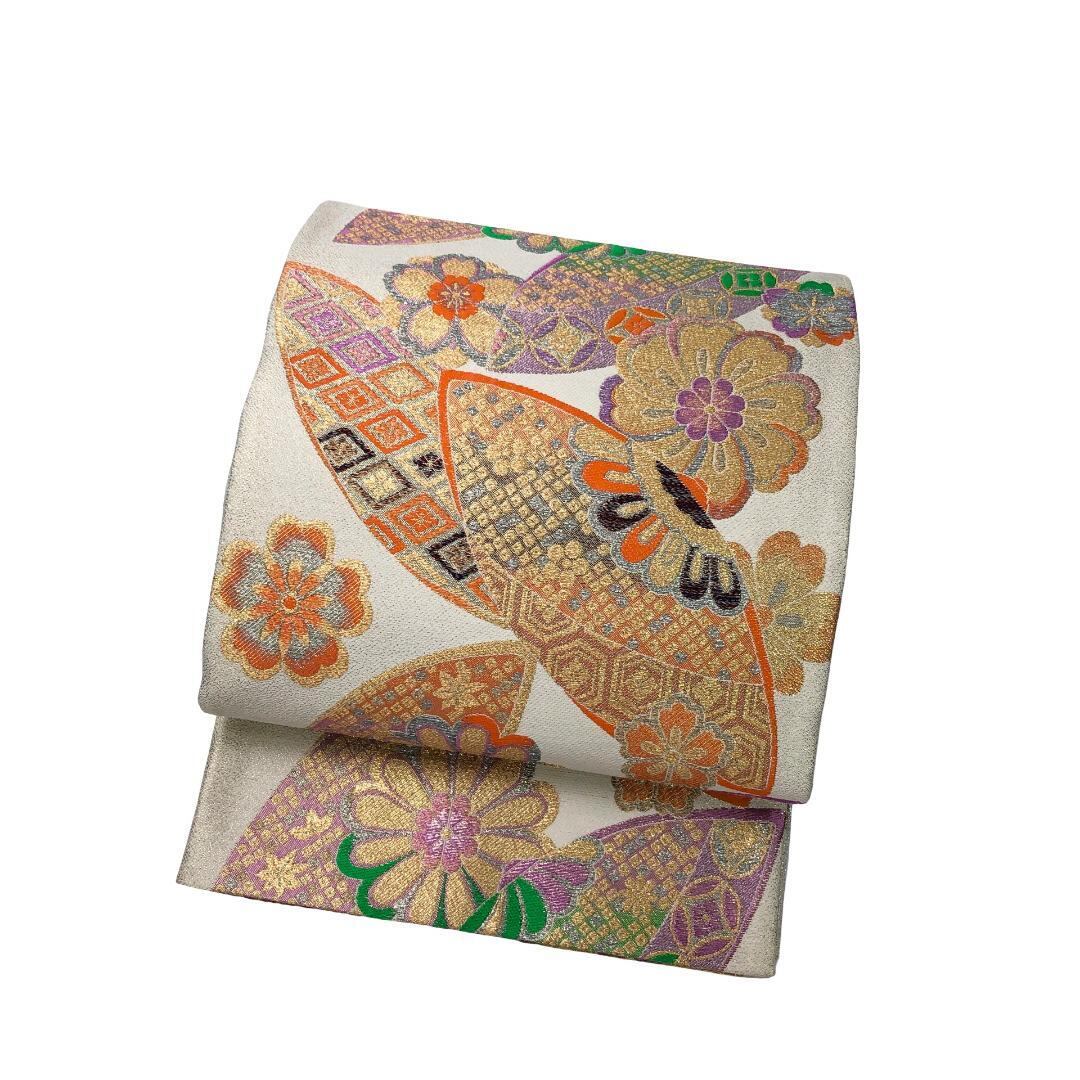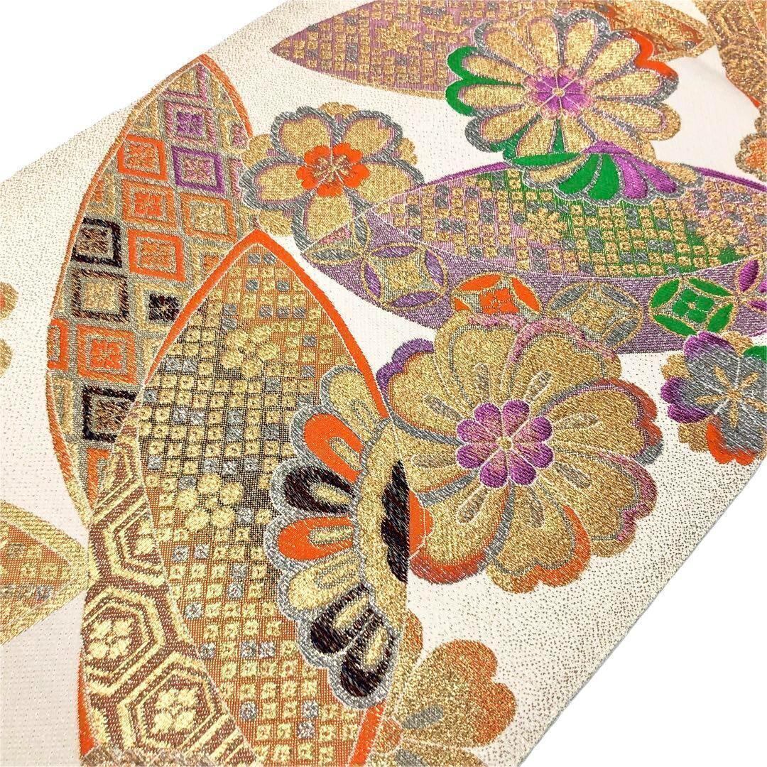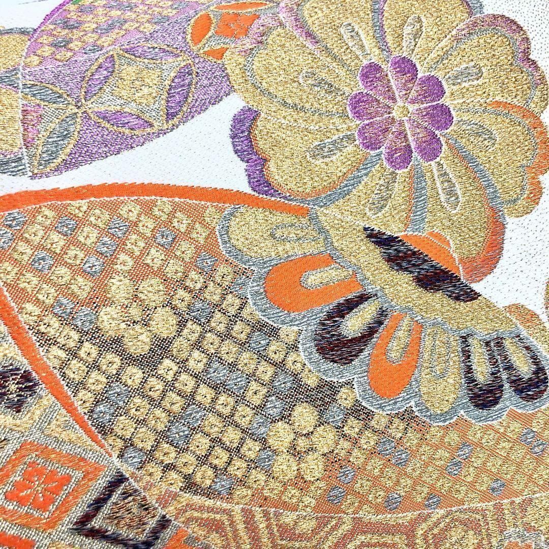 乳白色のお色味に花柄に七宝、花菱などの色々な柄裄が金糸を使って煌びやかにデザインされた素敵なお品でございます。