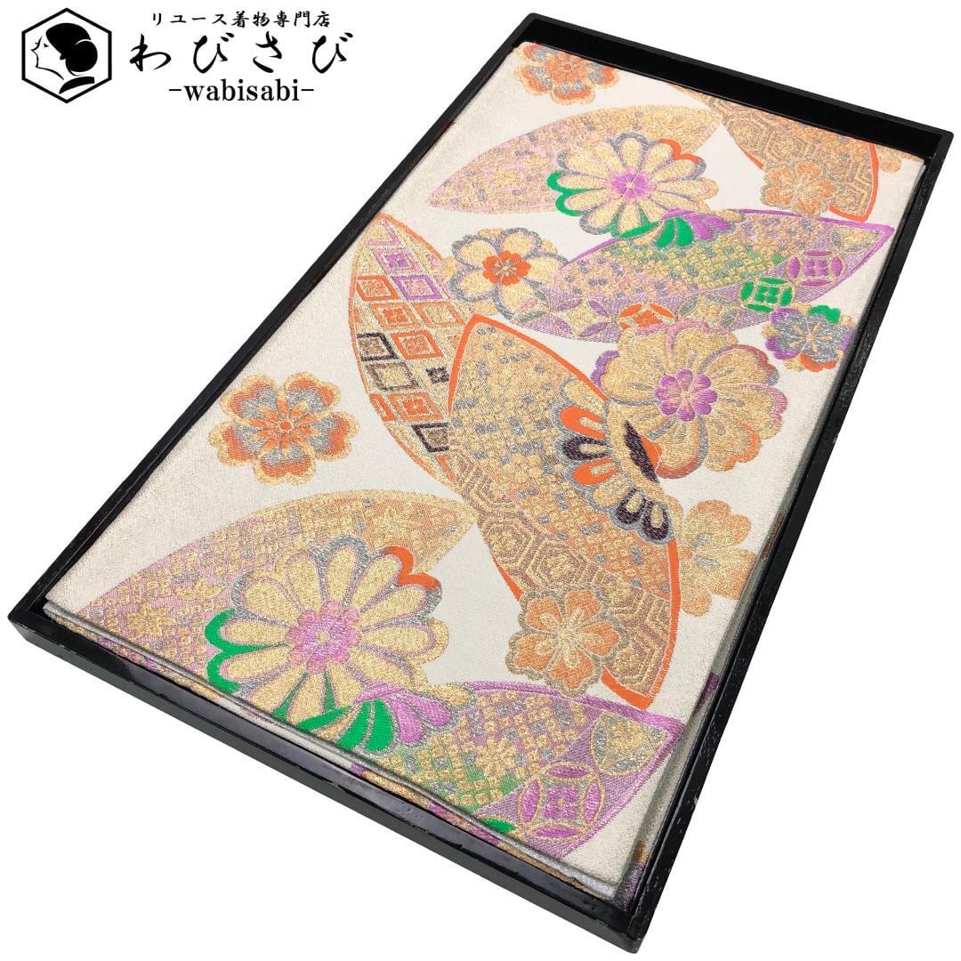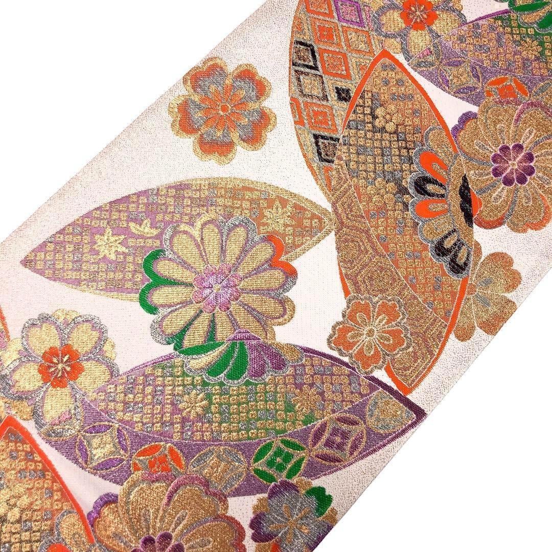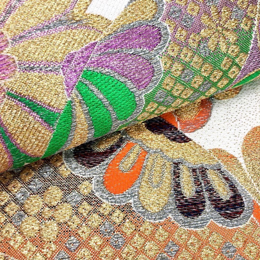 乳白色のお色味に花柄に七宝、花菱などの色々な柄裄が金糸を使って煌びやかにデザインされた素敵なお品でございます。