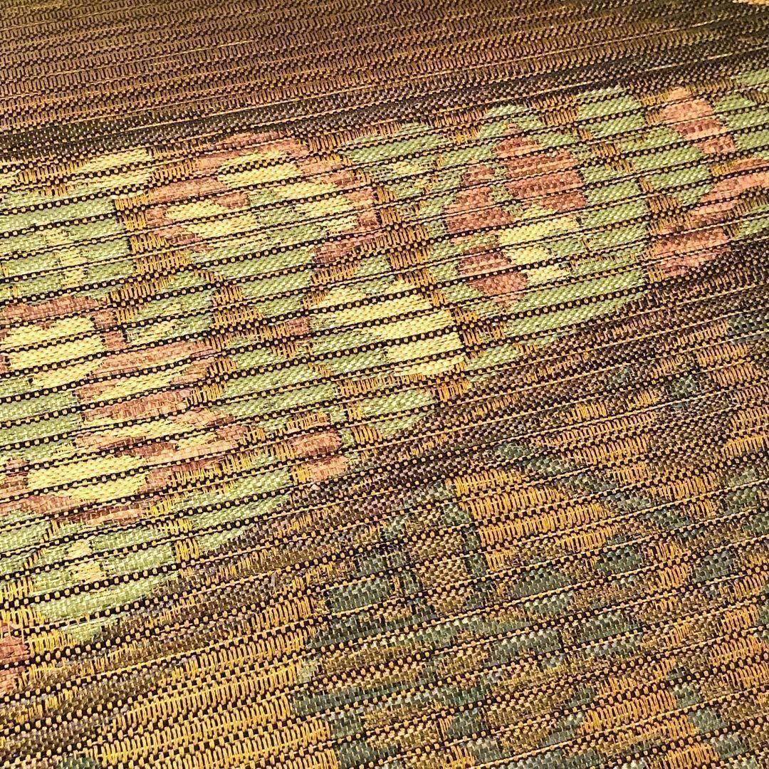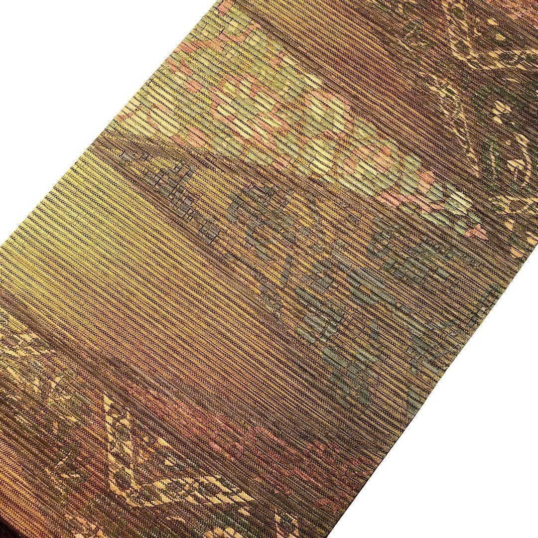 木蘭色の落ち着いたお色味のグラデーション、横縞の立体的な織に花柄模様がデザインされた素敵なお品でございます。