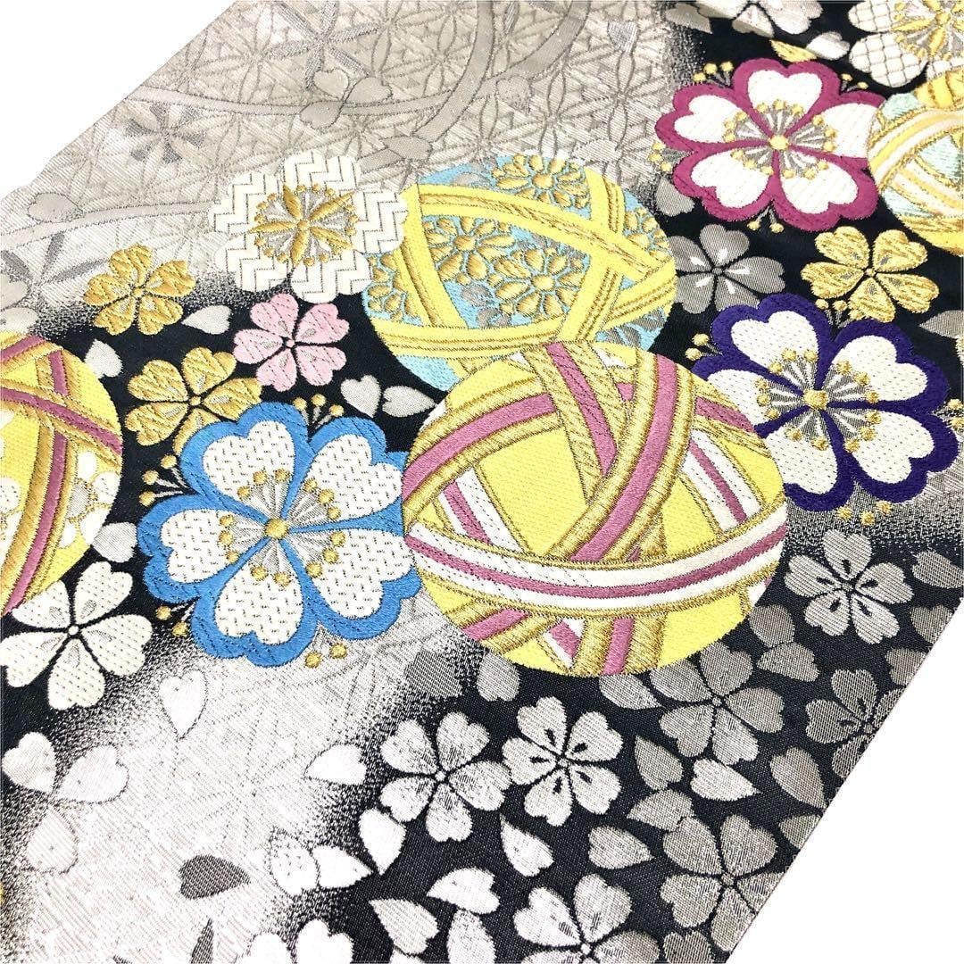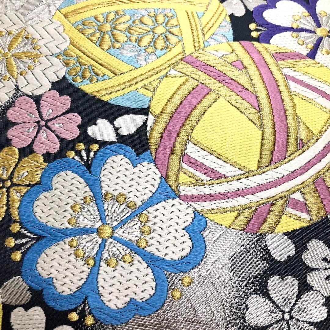 銀色ベースのお色に金糸を使ったパステルカラーの手毬に桜の花模様がデザインされた素敵なお品でございます。