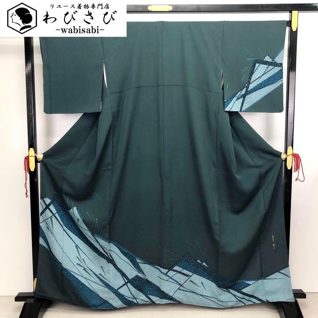 深緑色の落ち着いた緑色に上品に染め上げられた抽象模様がデザインされた素敵なお品でございます。