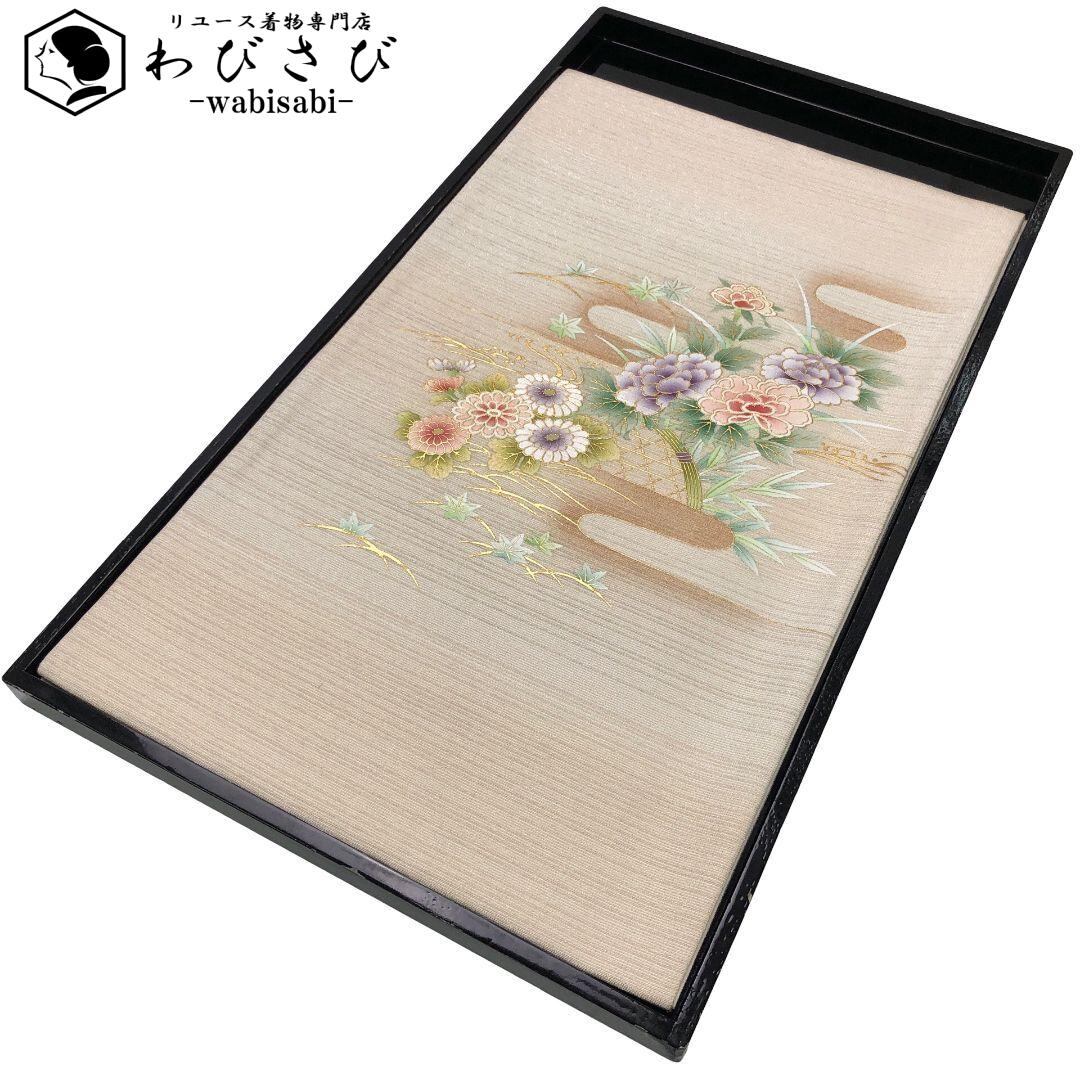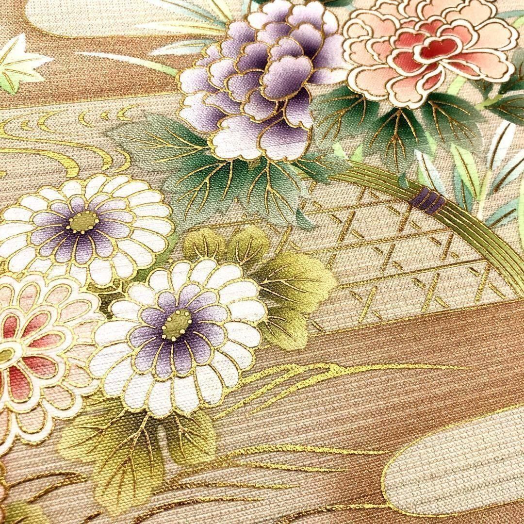 生成色の上品なお色味に金通しに横縞模様、金彩を使った美しい花々がデザインされた素敵なお品でございます。