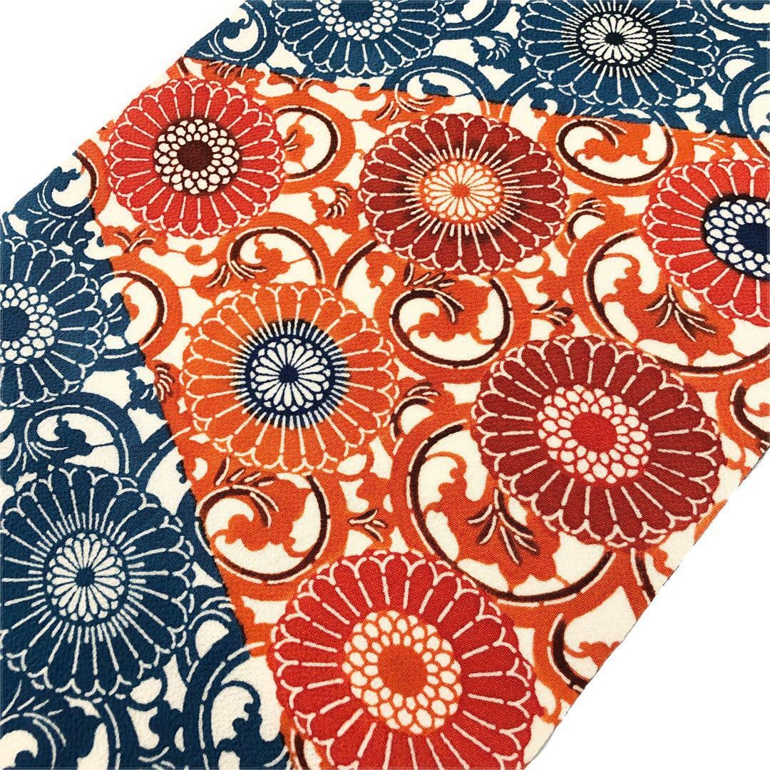 手触りの良い上質な縮緬地に鮮やかな菊唐草模様の型染がデザインされた素敵なお品でございます。