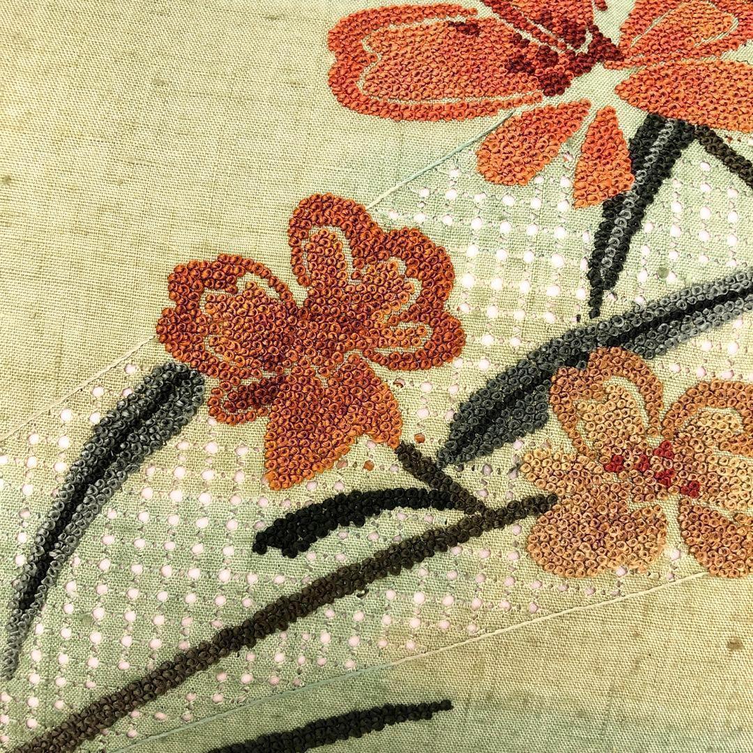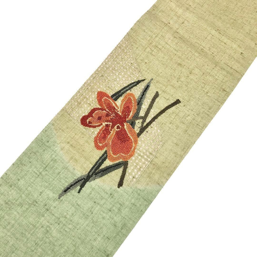 名古屋帯 紬 汕頭刺繍 相良刺繍 花柄模様 若緑色 O-2986
