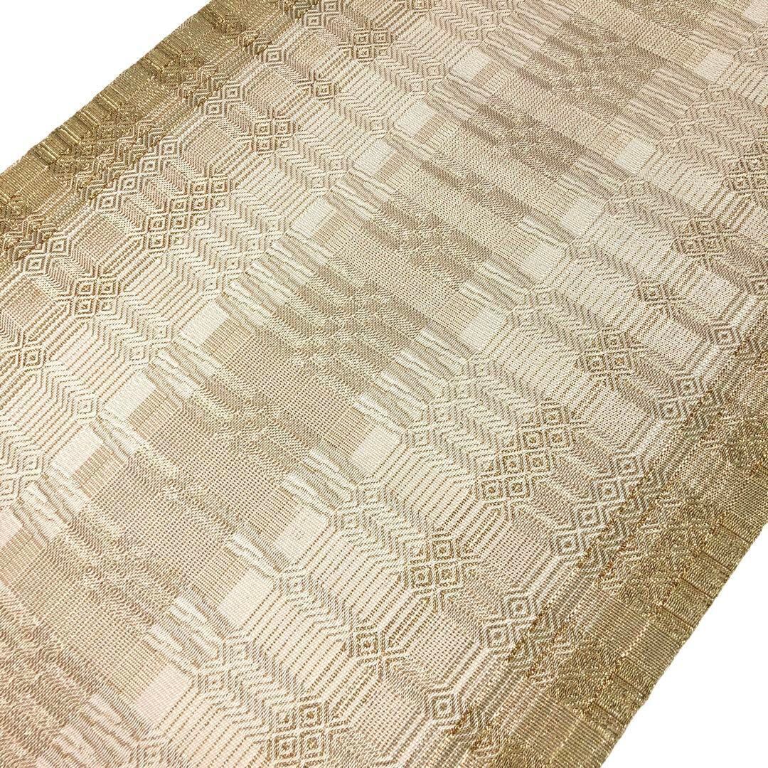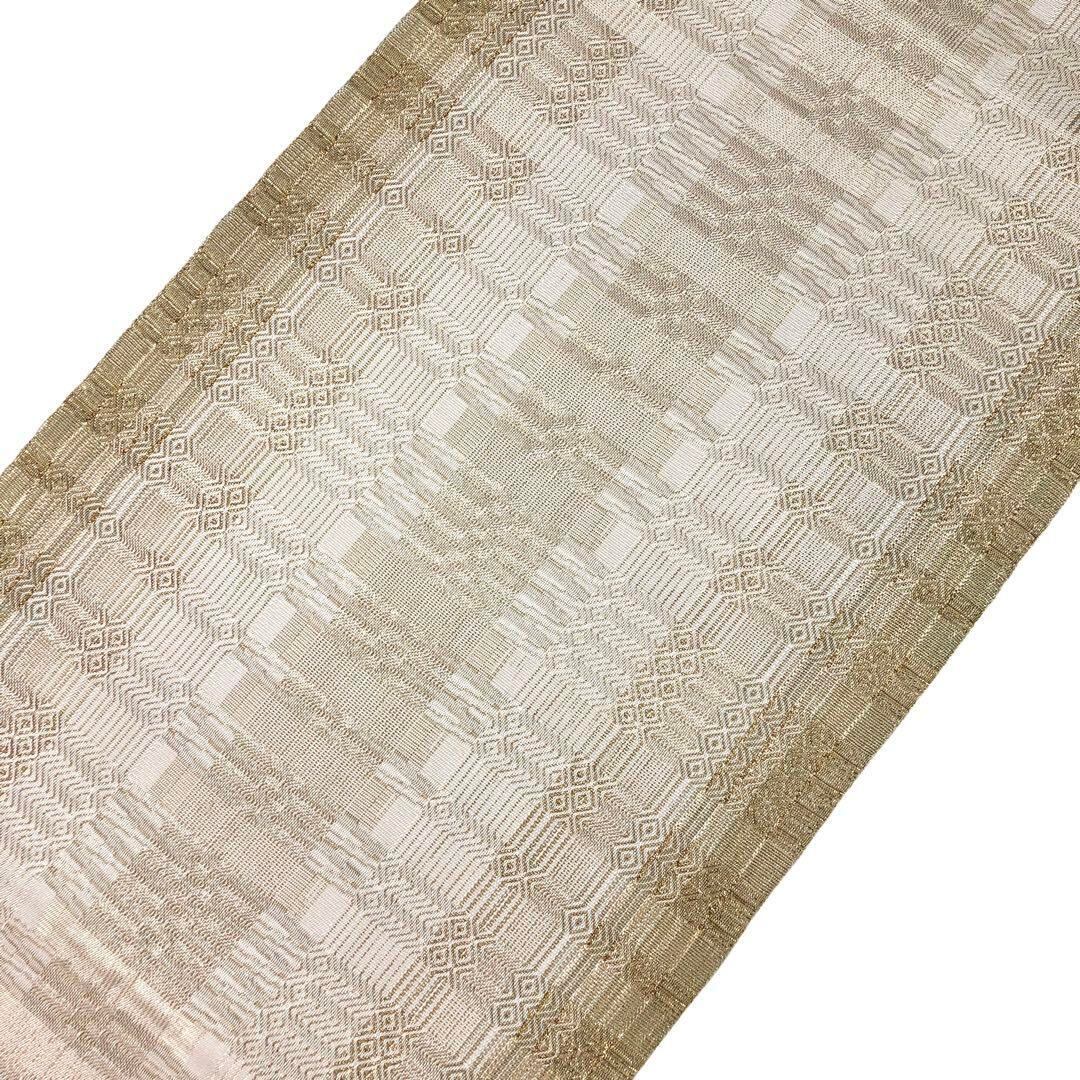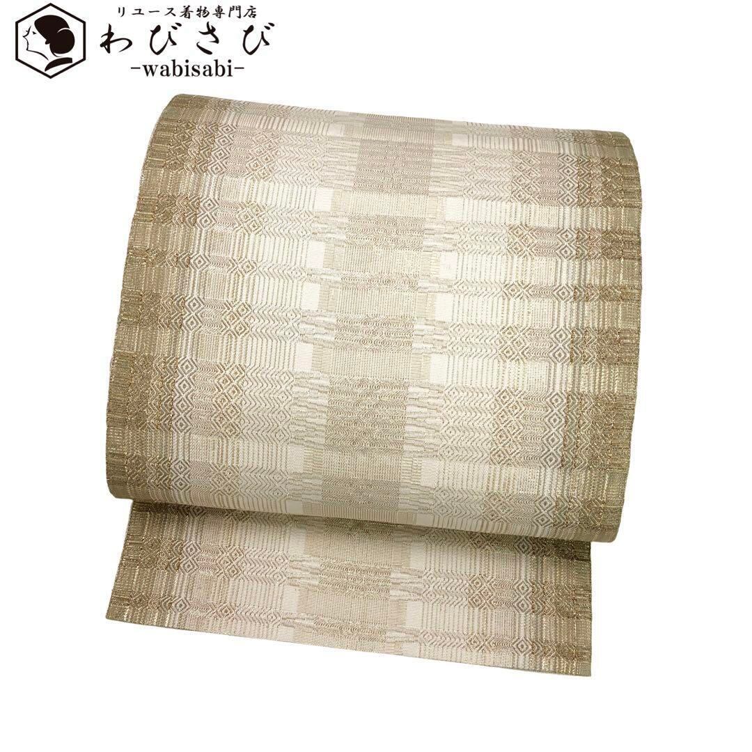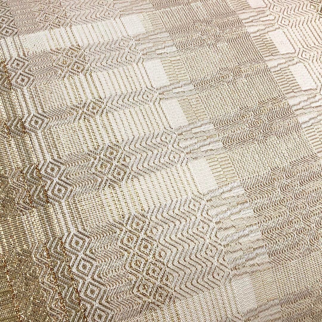 薄生成色ベースのお色に金糸でデザインされた美しい織模様と縦柄のグラデーションが上品で素敵なお品でございます。