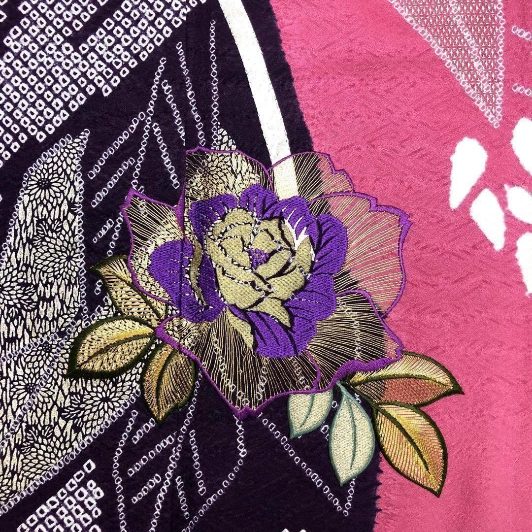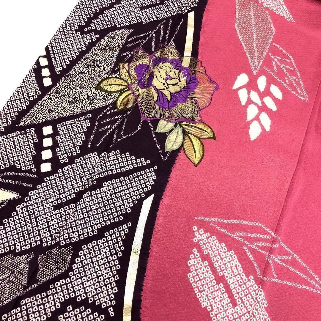 振袖 薔薇の刺繍花模様 絞り花模様 紗綾形 紅鶸色 K-3224 着物 きもの kimono 和服 和装 中古 リサイクル着物 【送料無料】