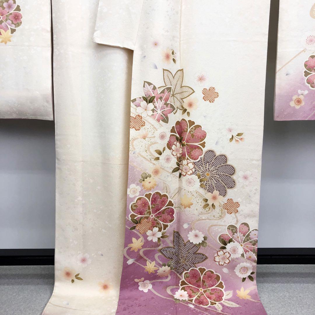 乳白色の品のあるお色味に淡い桃色の暈し、美しい花模様がデザインされた素敵なお品でございます。