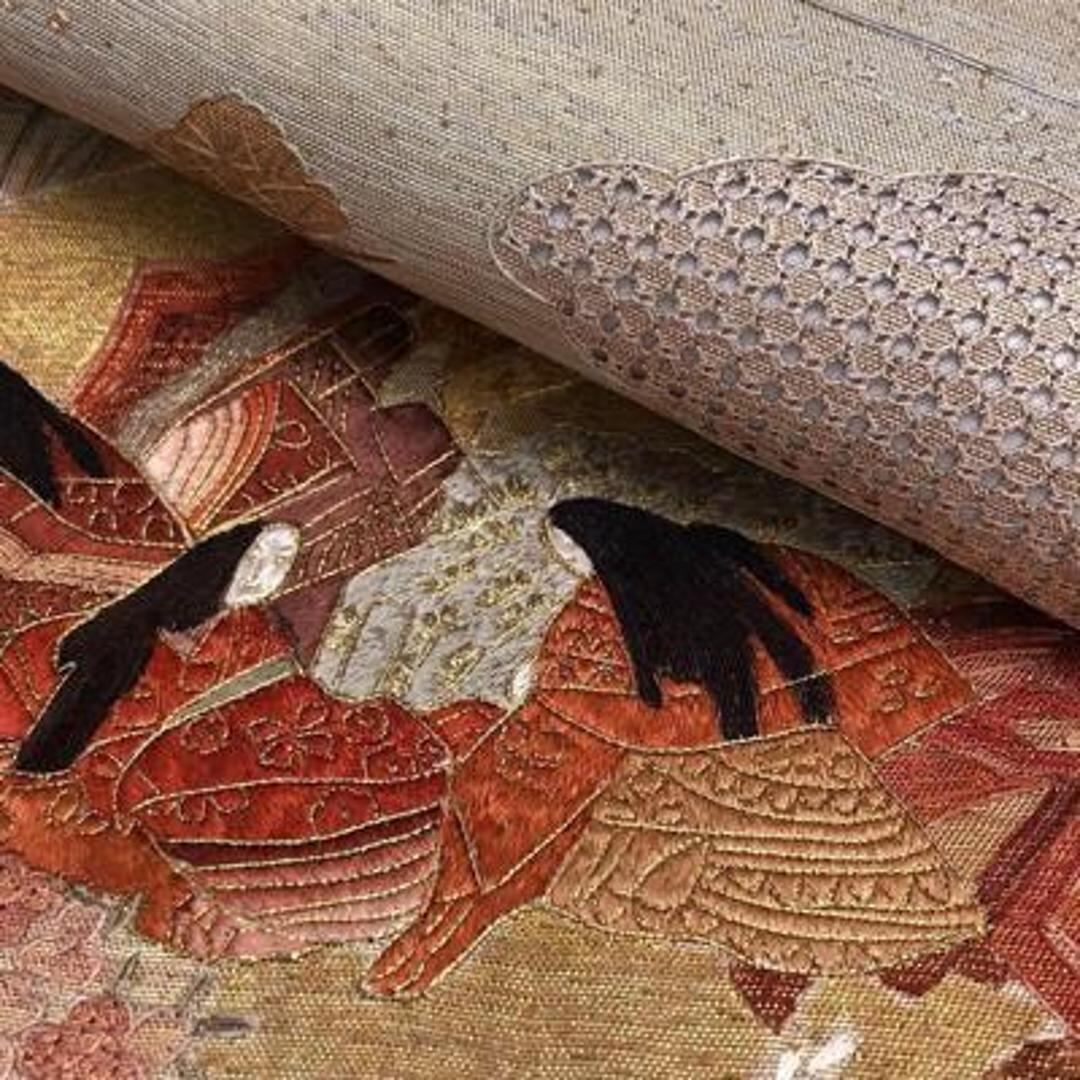 汕頭刺繍などの刺繍柄の綺麗な花々や松の木の美しい風景に十二単の女性、御所車がデザインされた素敵なお品でございます。