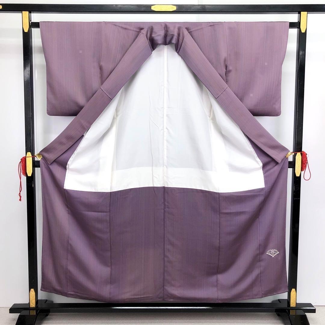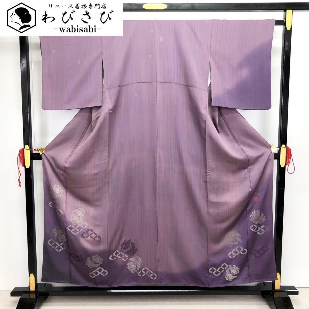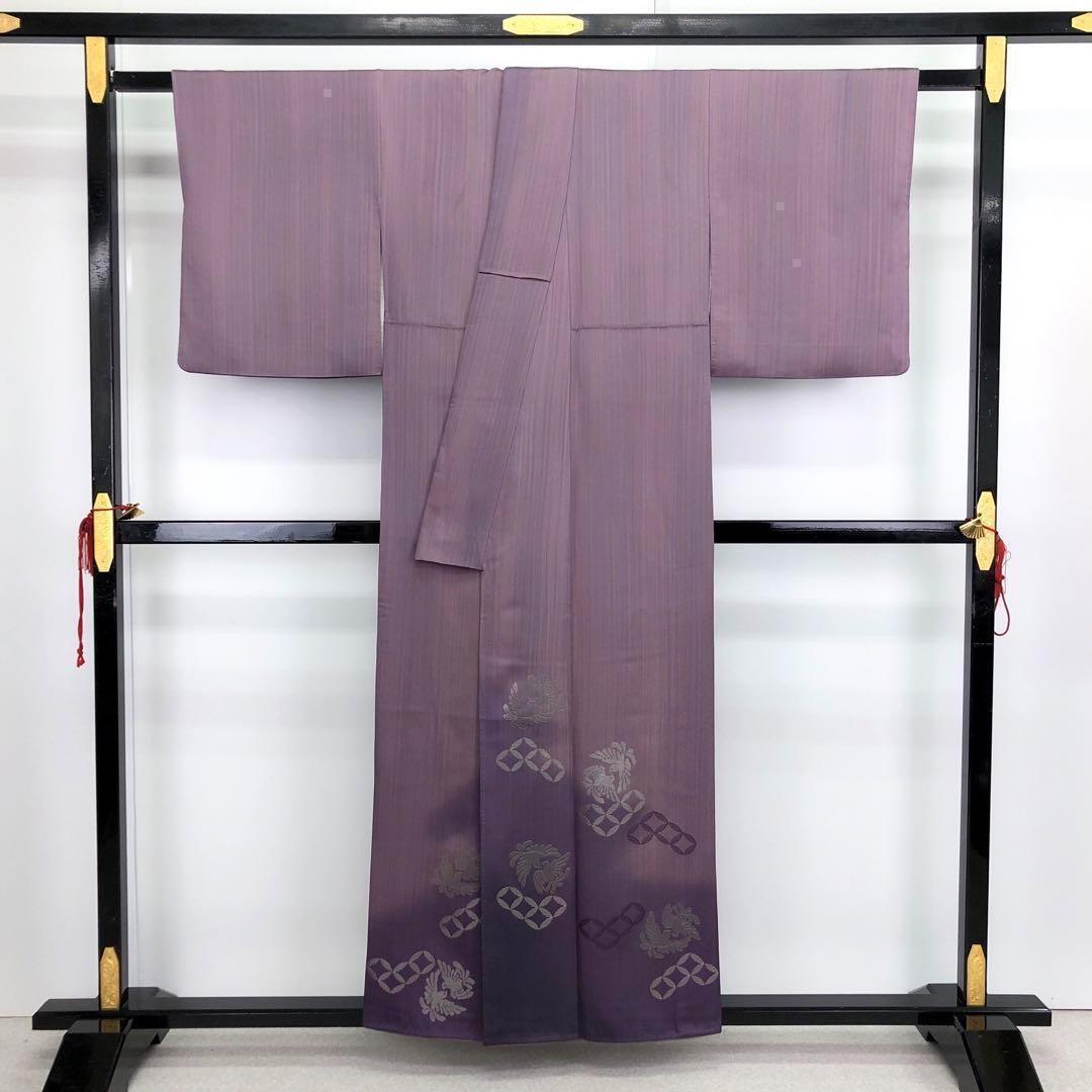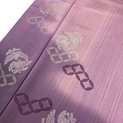 紫色の縦縞模様に銀糸刺繍を使った双鳥七宝繋ぎの柄裄がデザインされた素敵なお品でございます。