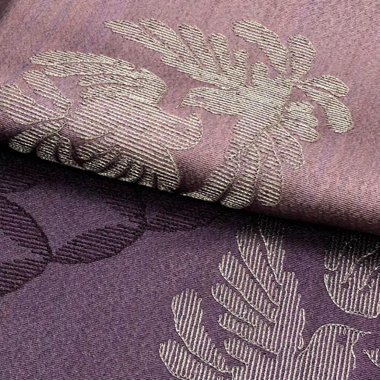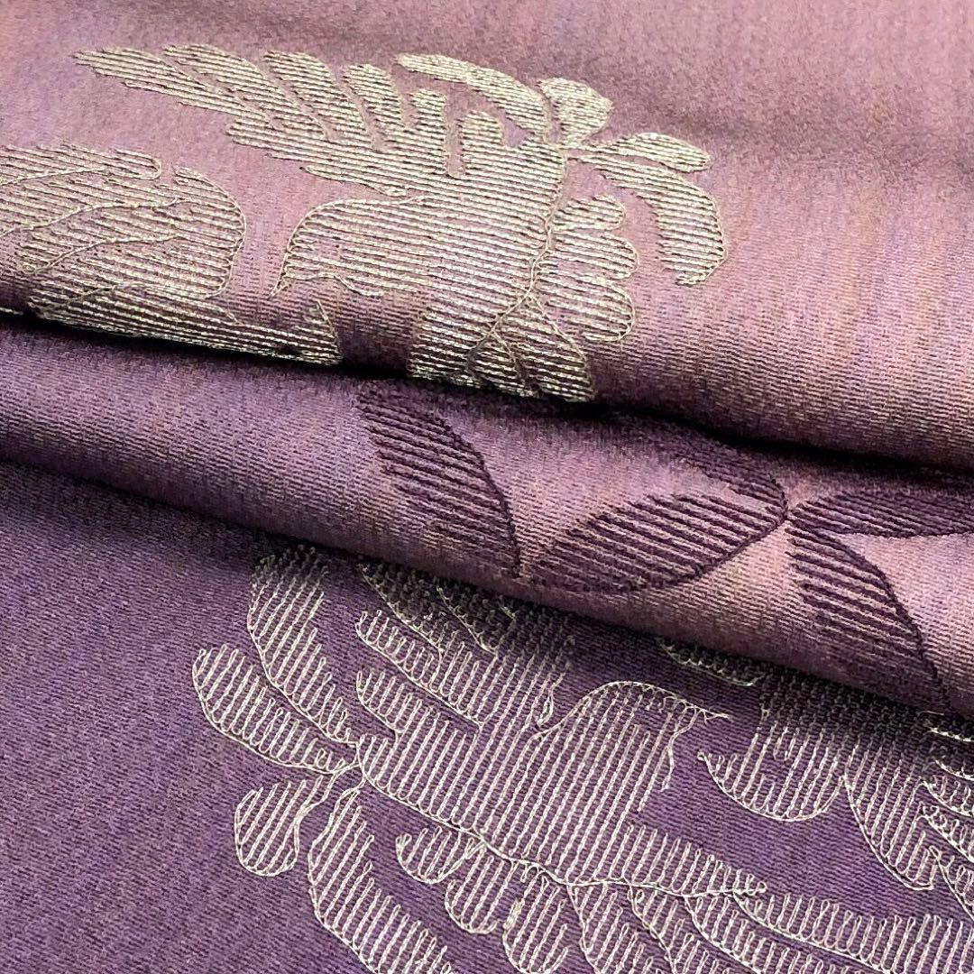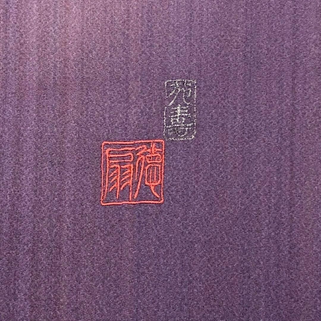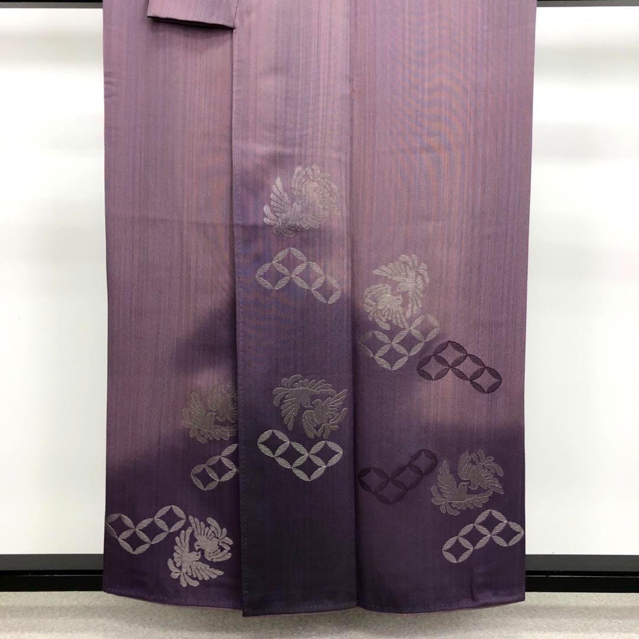 紫色の縦縞模様に銀糸刺繍を使った双鳥七宝繋ぎの柄裄がデザインされた素敵なお品でございます。
