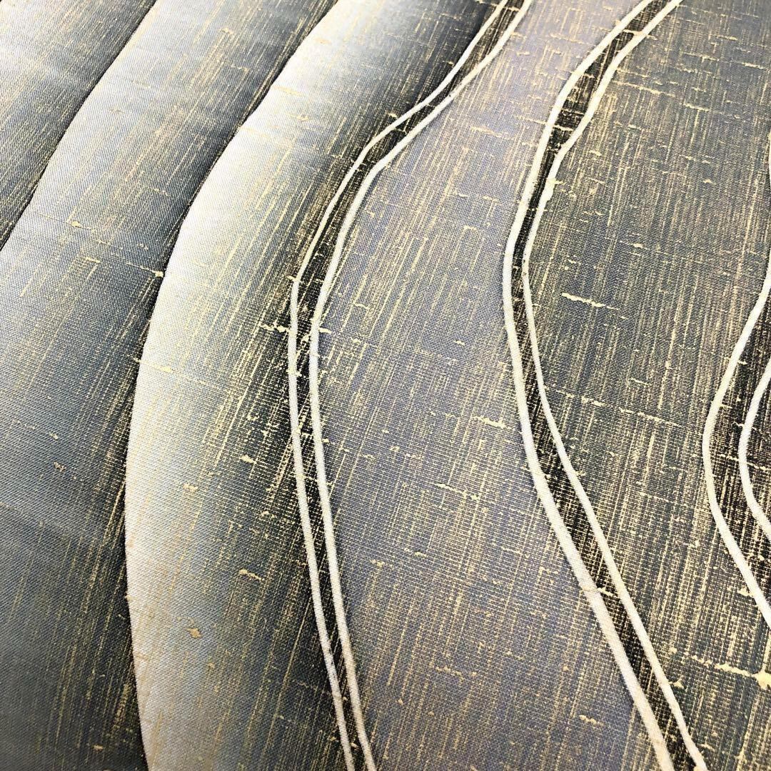 灰緑色の落ち着いたお色味に縦柄にデザインされた層のような曲線模様がデザインされた素敵なお品でございます。