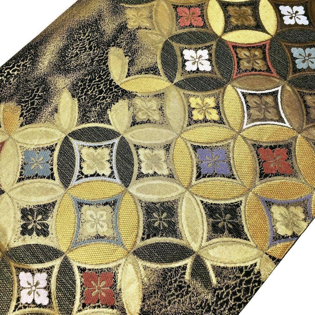 落ち着いた緑色に金糸を使って煌びやかにデザインされた花七宝繋ぎの柄裄が素敵なお品でございます。