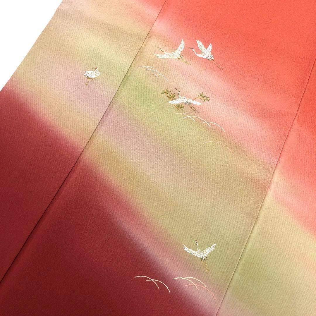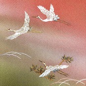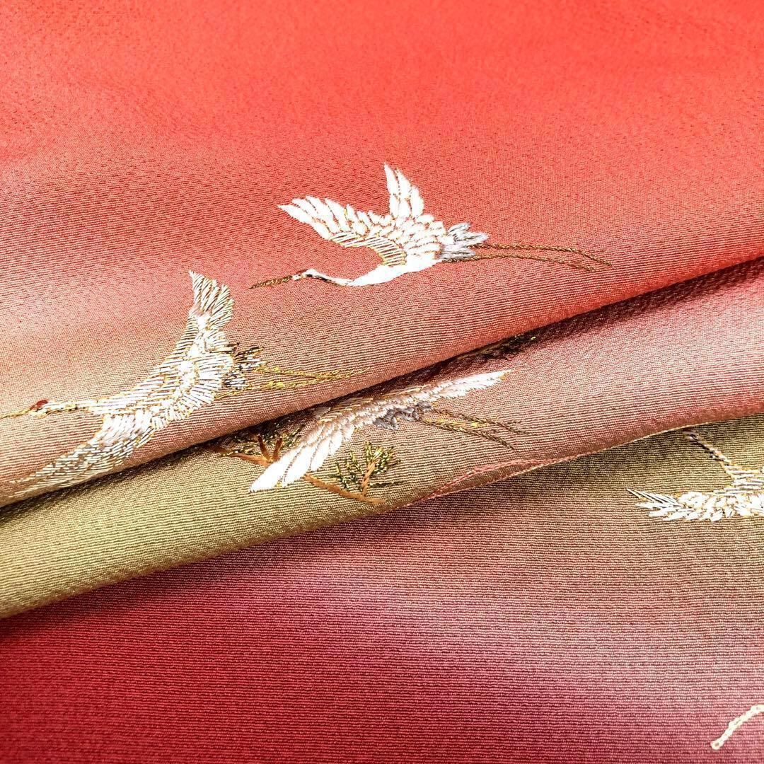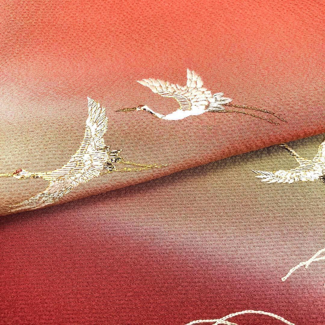 中紅色の鮮やかな赤味に暈し色がまるで夕暮れ時の風景の様で煌びやかな刺繍の飛翔鶴が夕暮れ時に羽ばたく鶴のような素敵なデザインのお品でございます。