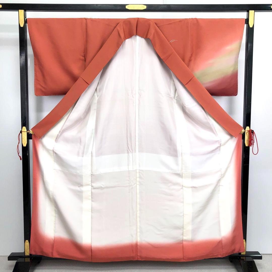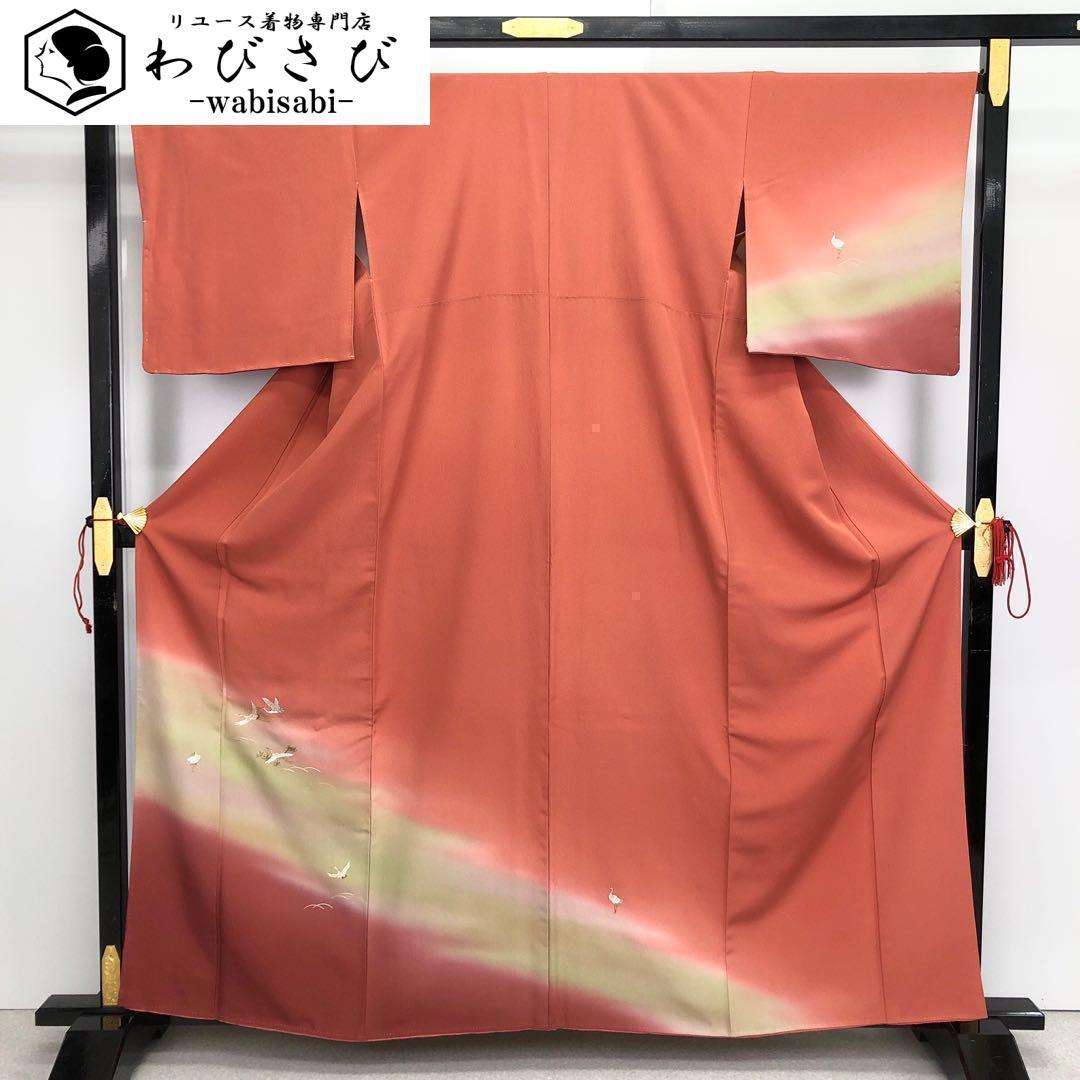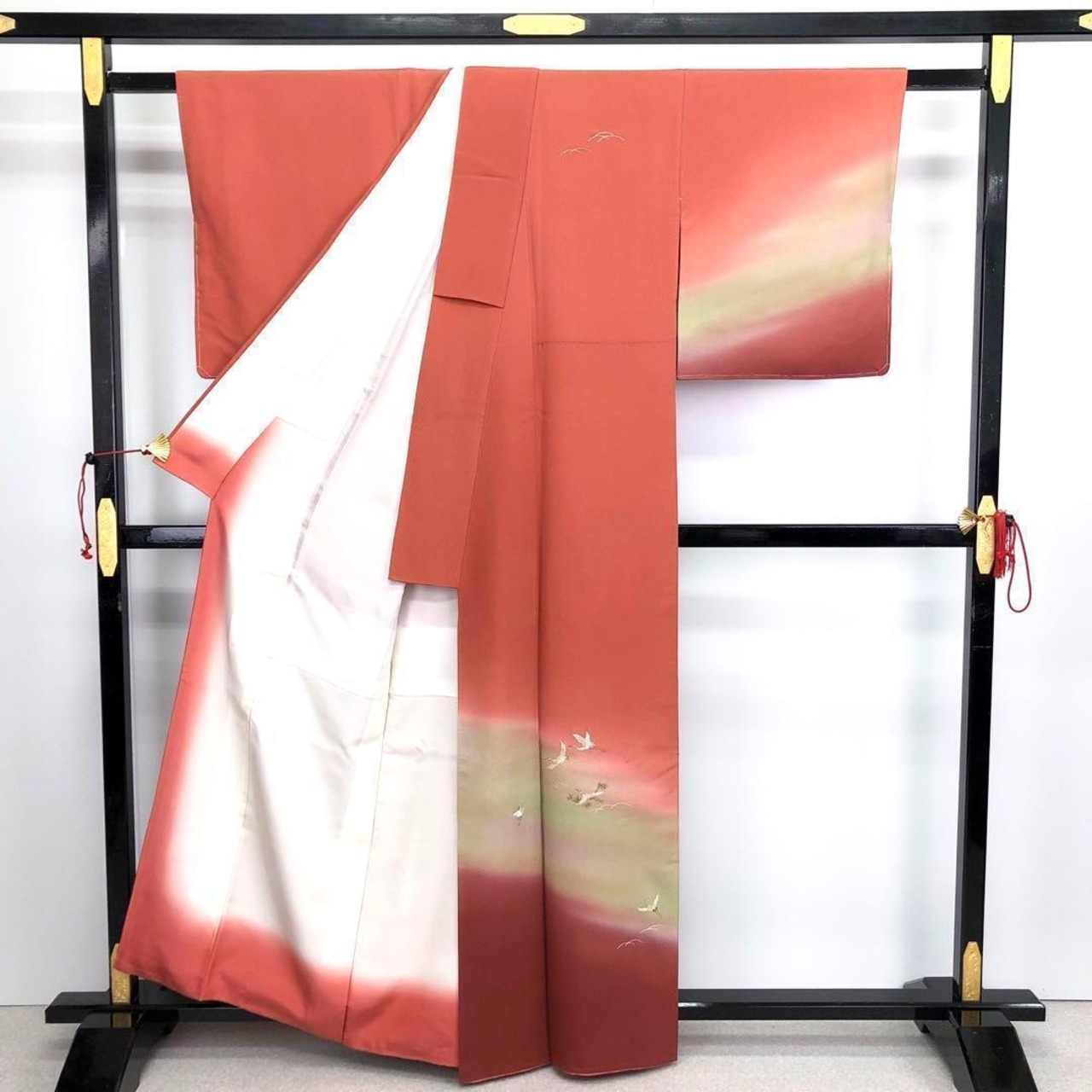 中紅色の鮮やかな赤味に暈し色がまるで夕暮れ時の風景の様で煌びやかな刺繍の飛翔鶴が夕暮れ時に羽ばたく鶴のような素敵なデザインのお品でございます。