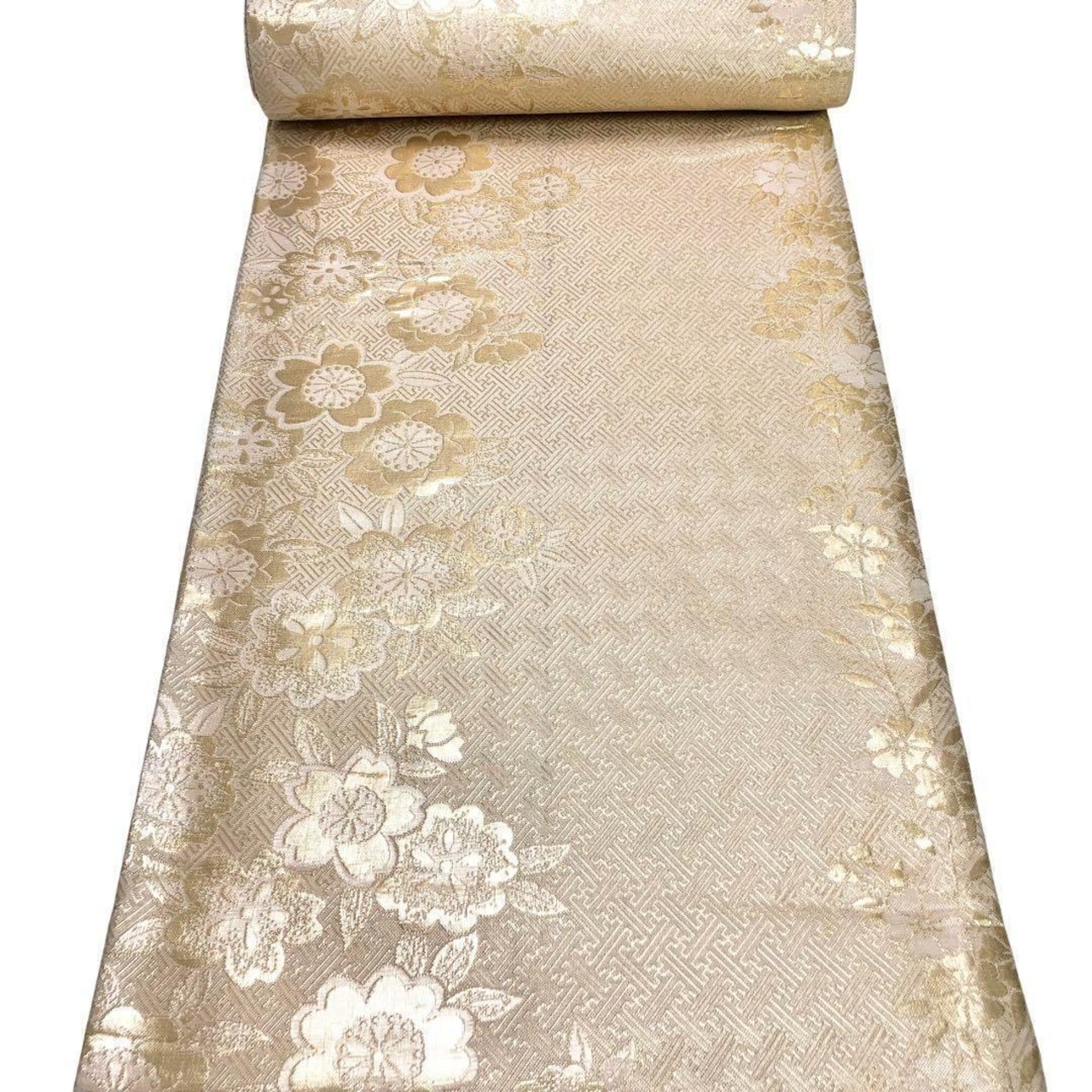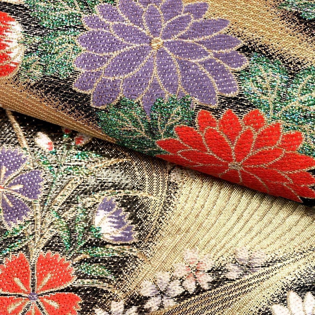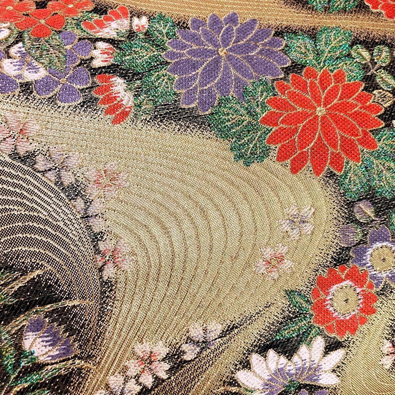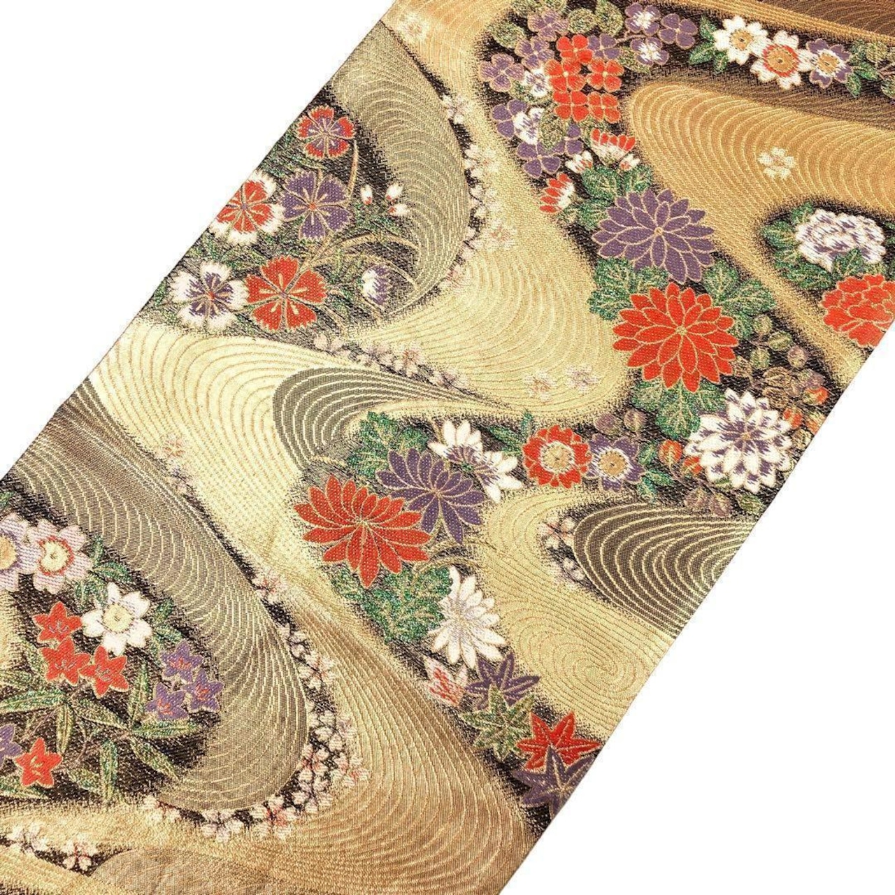 金色ベースのお色味に彩り鮮やかな四季の花々に流水模様がデザインされた素敵なお品でございます。