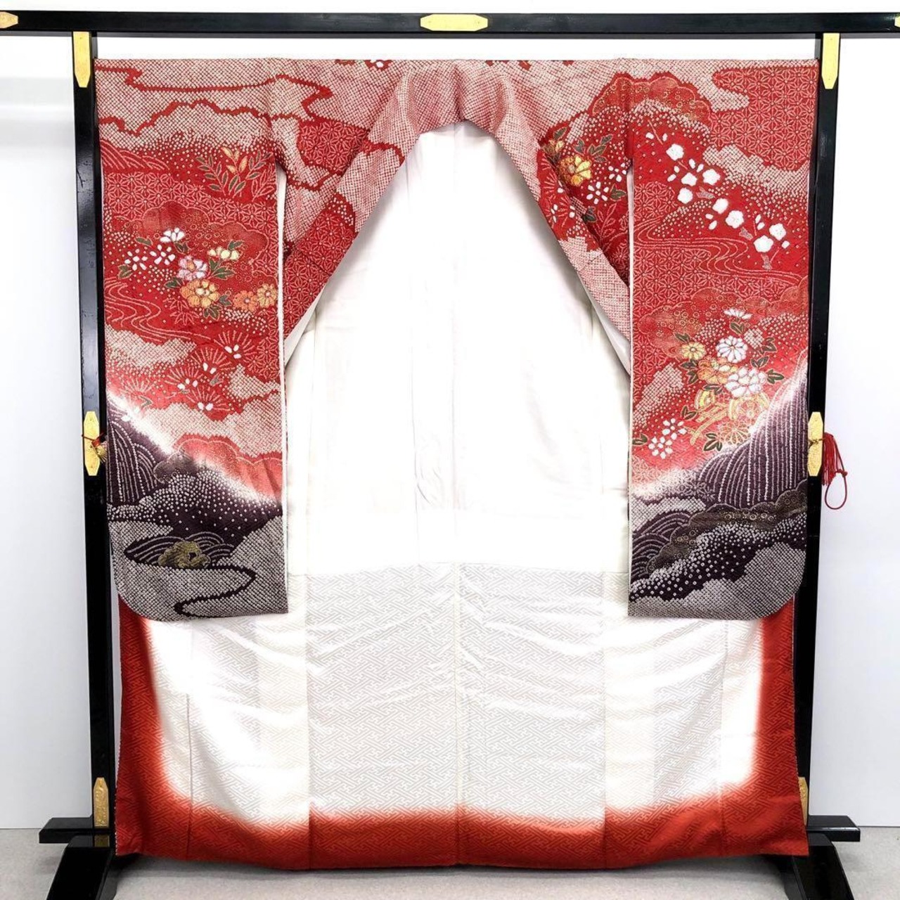 彩りの良い赤色に黒系暈しの総絞り、金彩を使った鮮やかな花柄模様がデザインされた素敵なお品でございます。