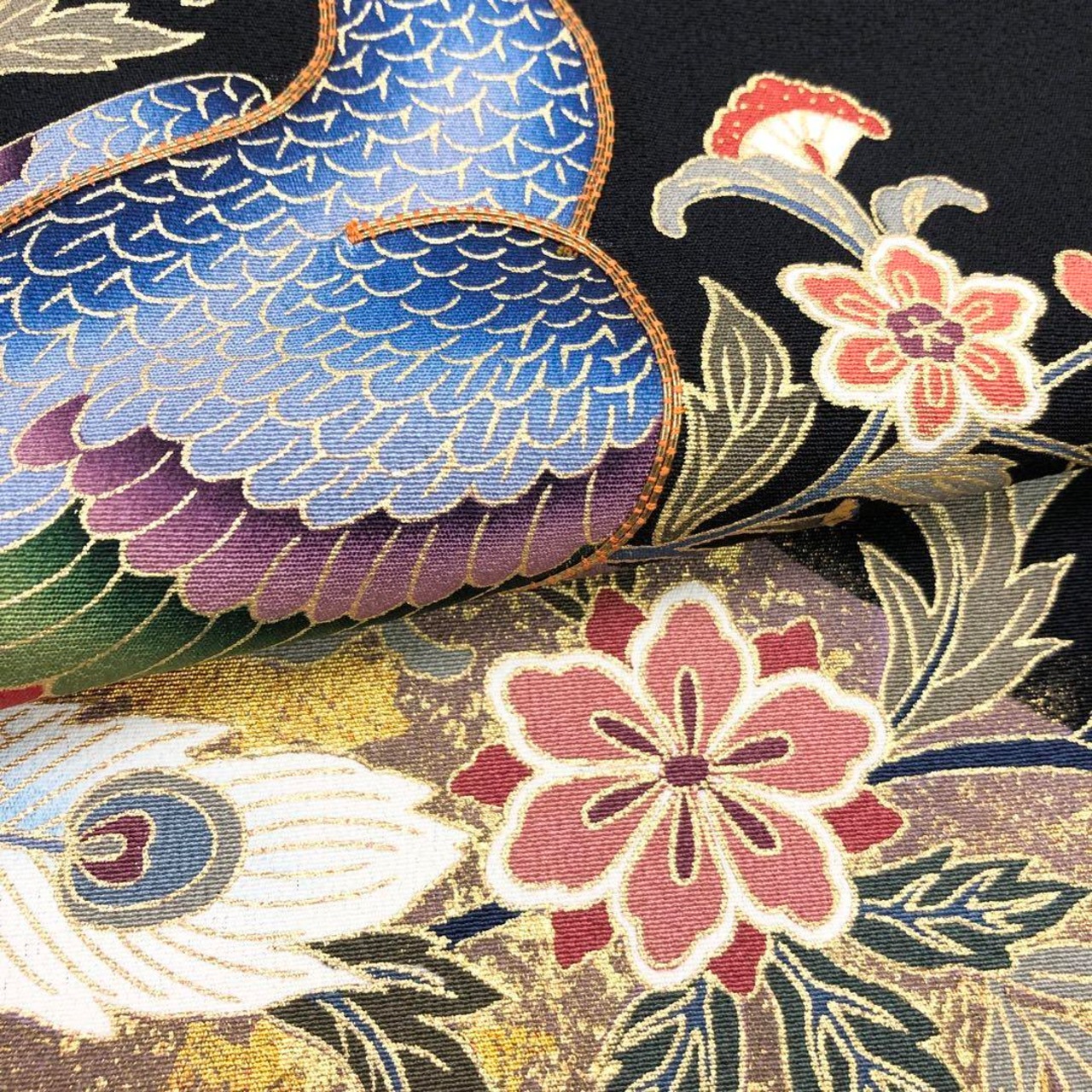金駒刺繍、金彩で煌びやかに彩り鮮やかな美しい孔雀に花柄模様の柄裄がデザインされた素敵なお品でございます。