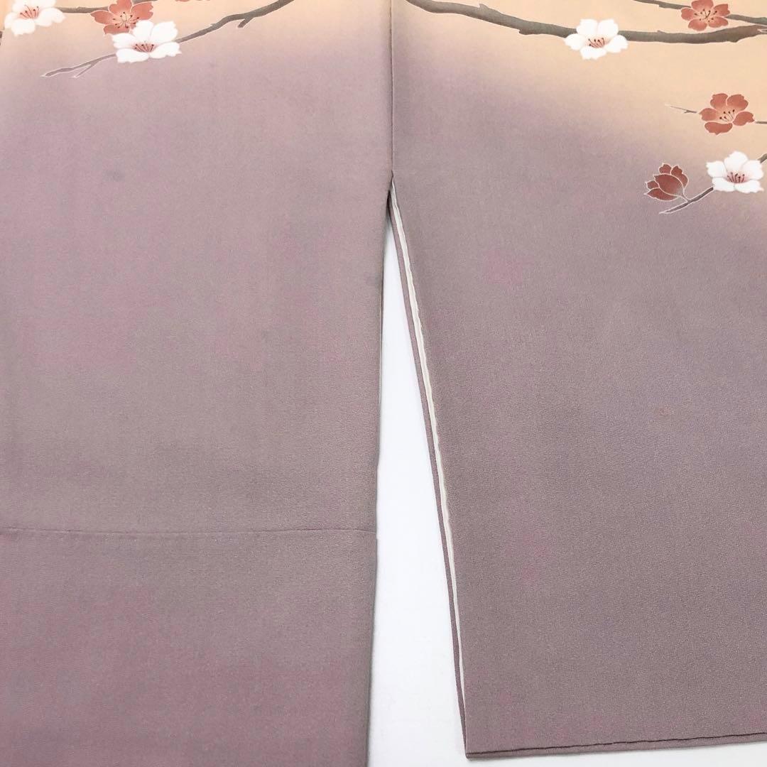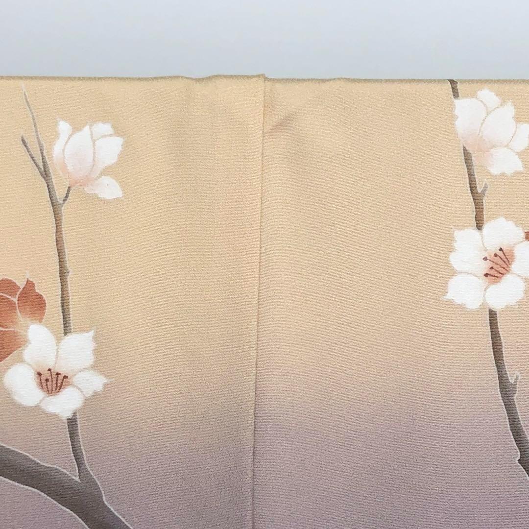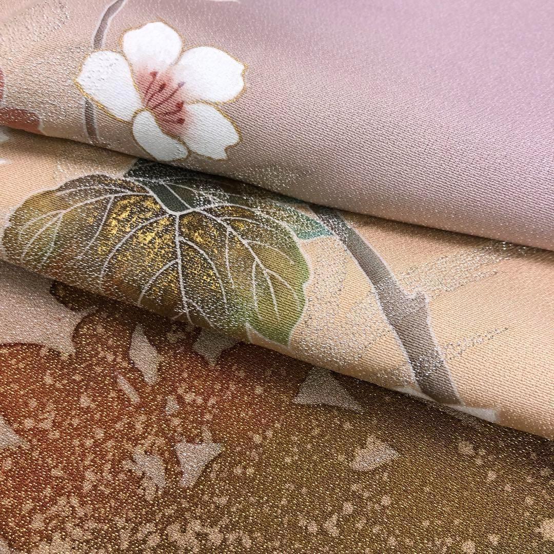 淡藤色の品のあるお色味に暈し、金銀通しに友禅の牡丹や梅の花模様がデザインされた素敵なお品でございます。