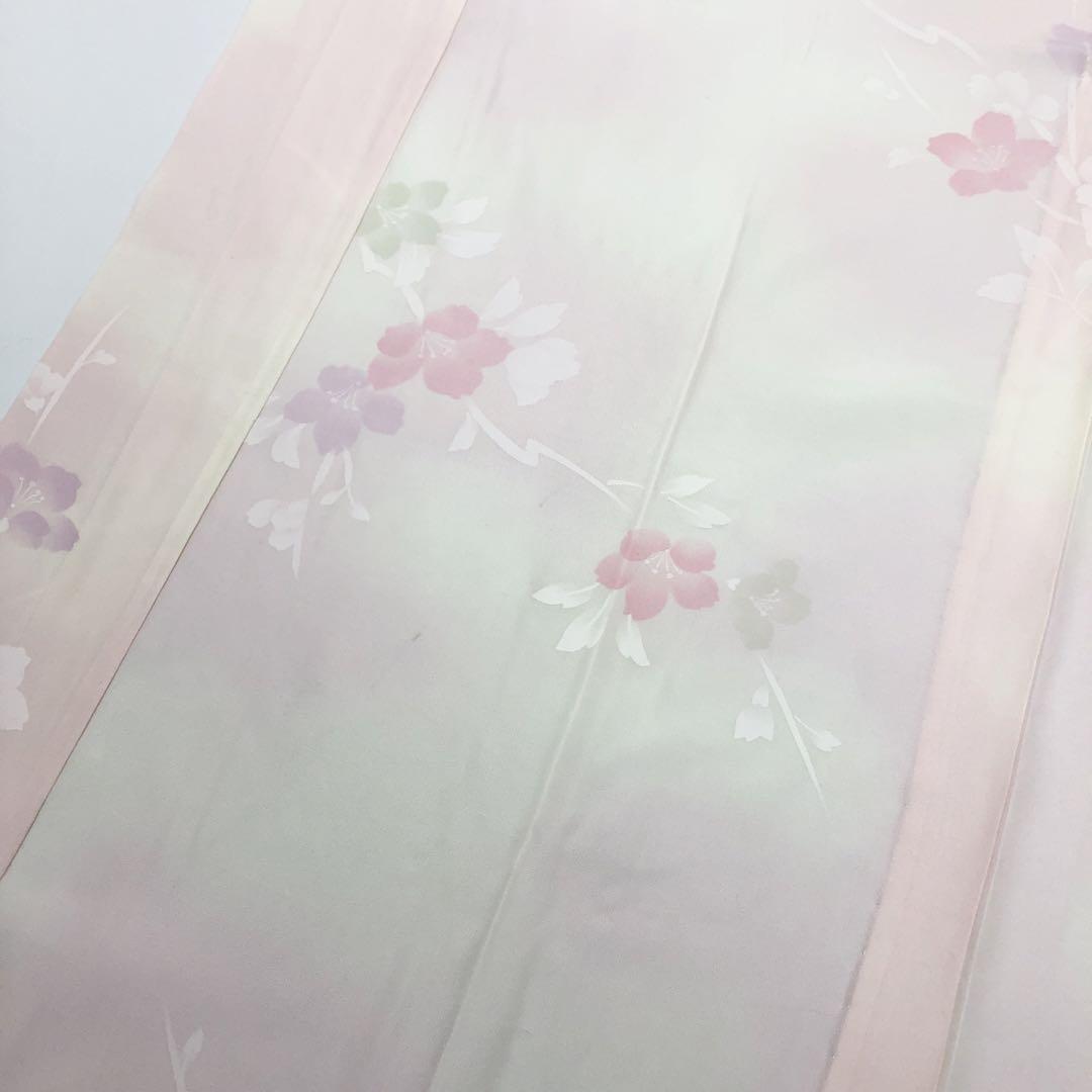 淡い薄桃色ベースの暈しに上品な花柄模様がデザインされた素敵なお品でございます。
