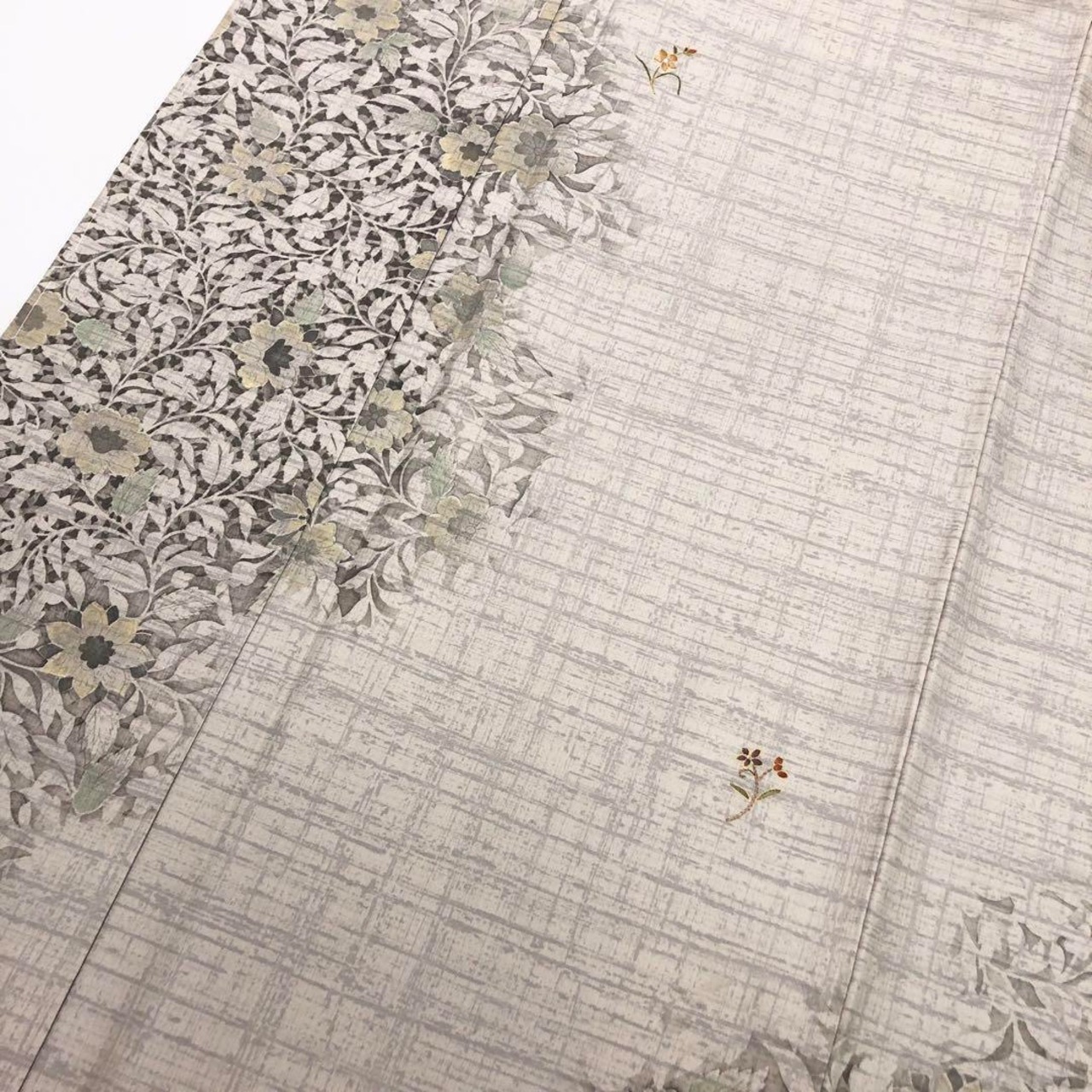 白練色ベースに地模様、くすみカラーの染大島に花草模様がデザインされた素敵なお品でございます。