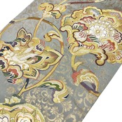 無形文化財保持者吉田文之、宝相華唐草文と題された白銅色の上品なお色味に金糸を使った美しい華柄模様がデザインされた素敵なお品でございます。