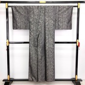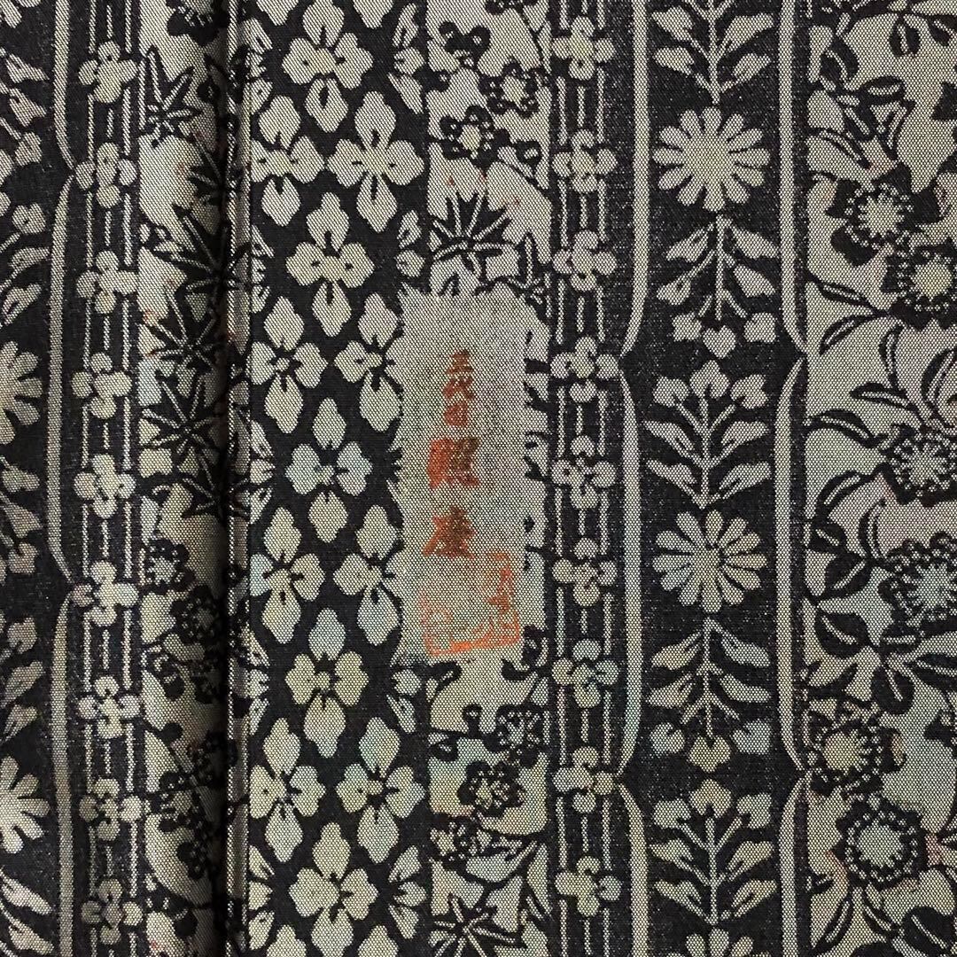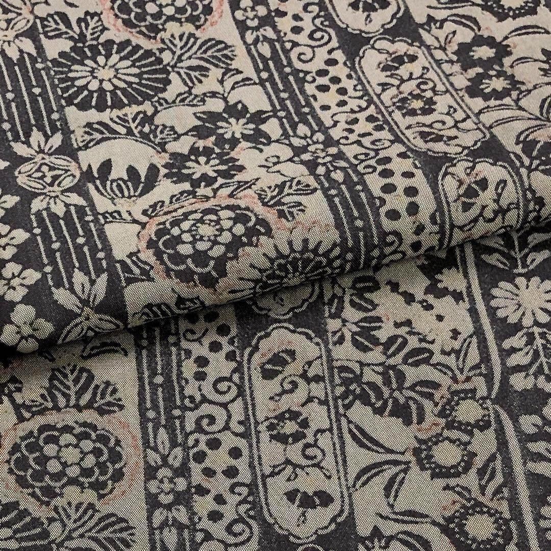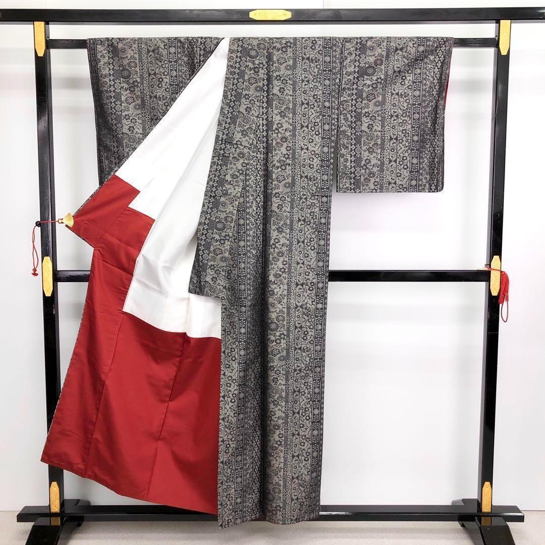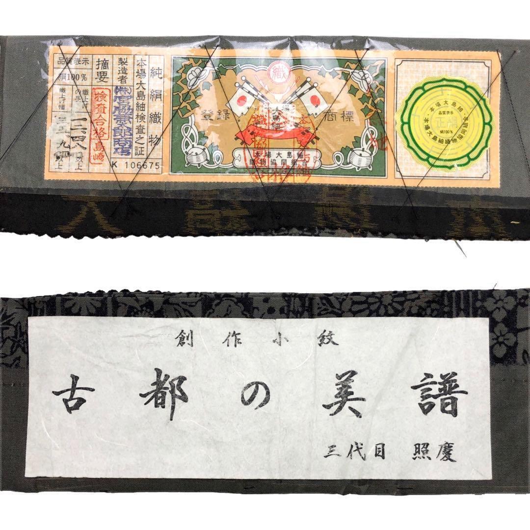 三代目照慶、古都の美譜と題された濃灰色ベースの美しい染め色、花唐草模様がデザインされた素敵な染大島のお品でございます。