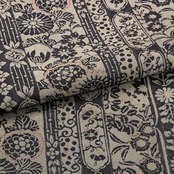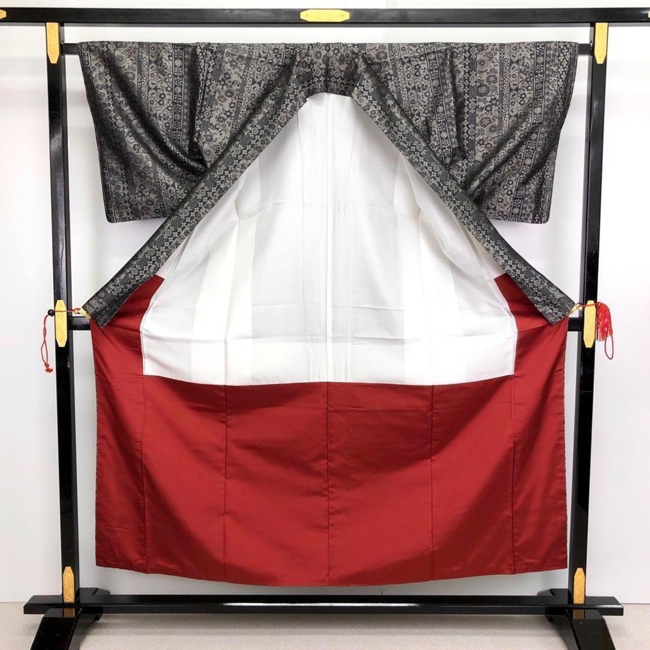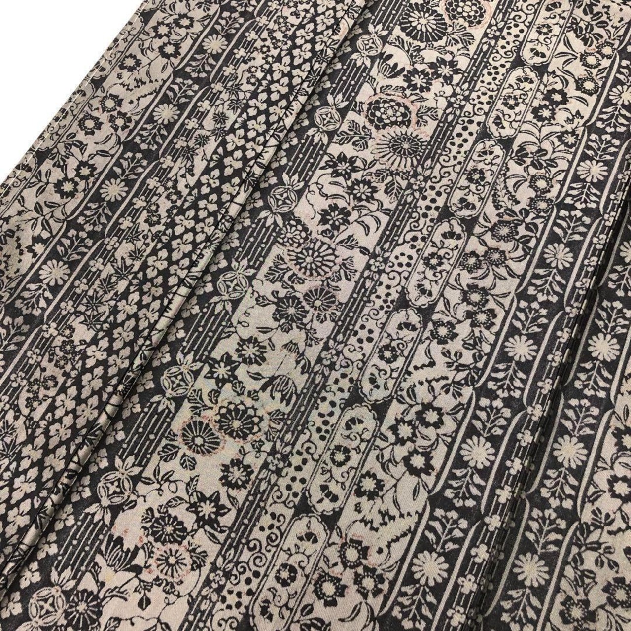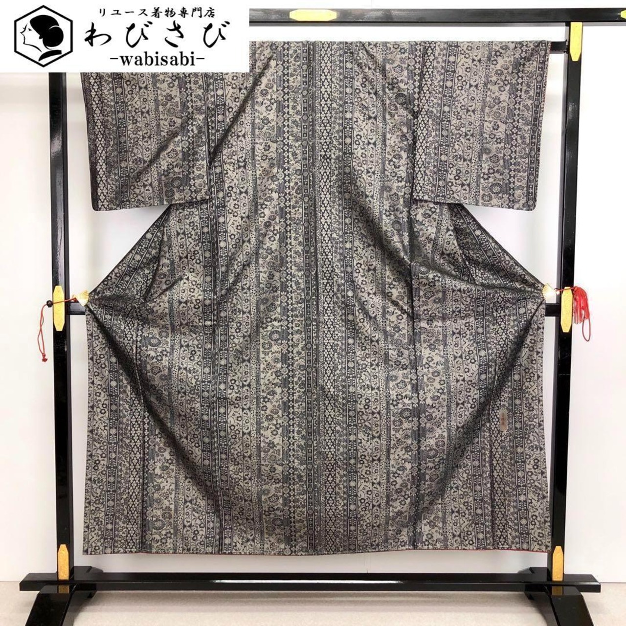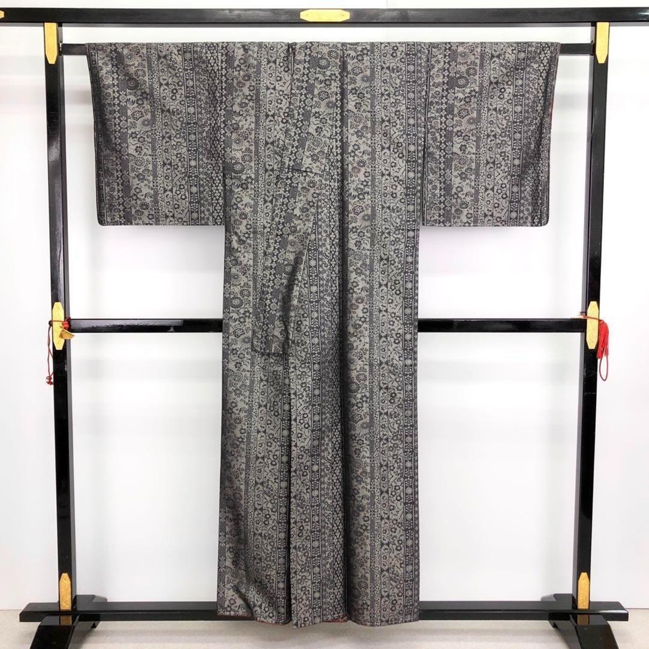 三代目照慶、古都の美譜と題された濃灰色ベースの美しい染め色、花唐草模様がデザインされた素敵な染大島のお品でございます。