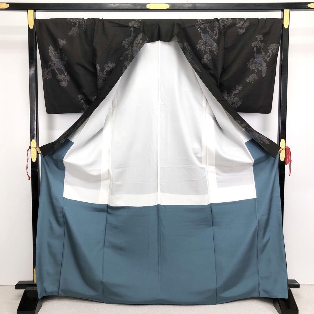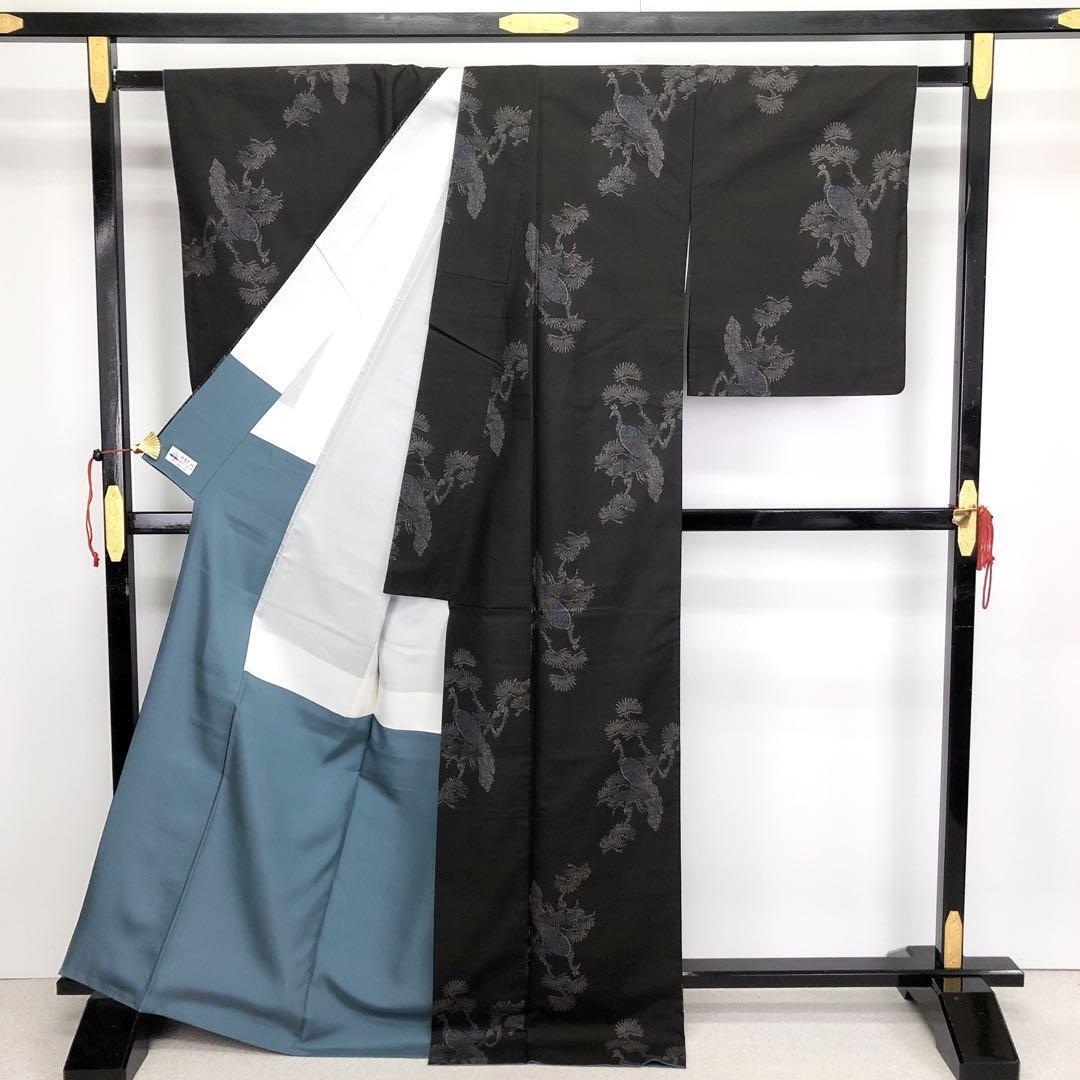 黒地の地空き、松の木の枝にとまる孔雀の柄裄がデザインされた素敵なお品でございます。