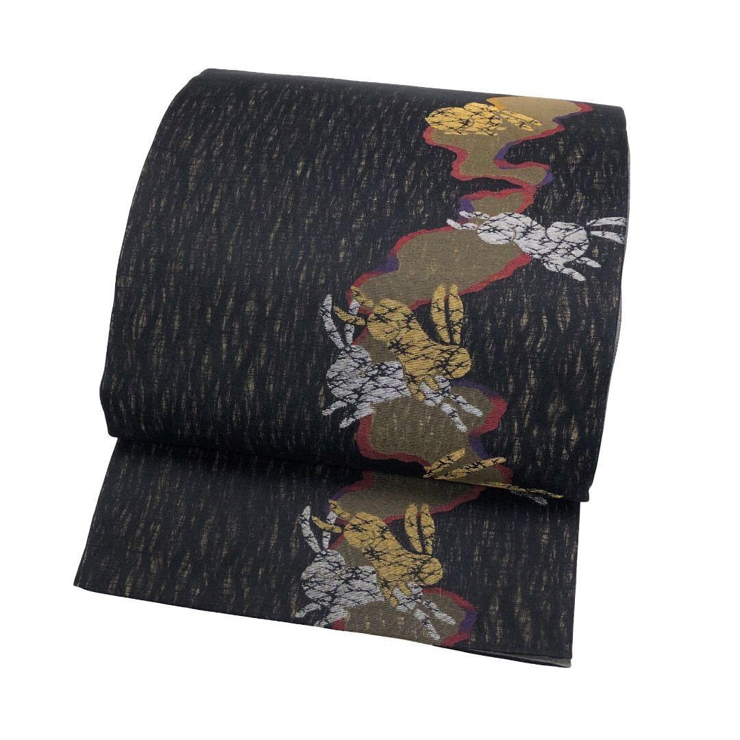 黒地の縦柄の透け感のあるすくい織り、霞模様に二匹のうさぎがデザインされた素敵なお品でございます。