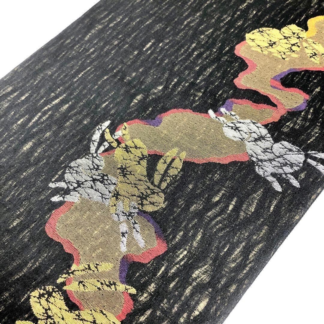 袋帯 すくい織 霞模様に二匹のうさぎ 兎 黒色 金銀糸 O-3062 着物 きもの kimono 和服 和装 中古 リサイクル着物 【送料無料】