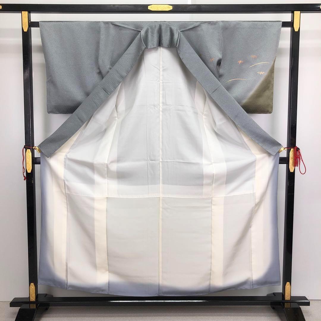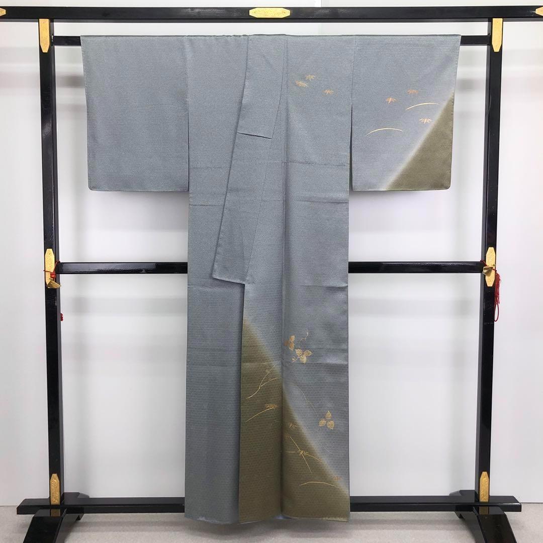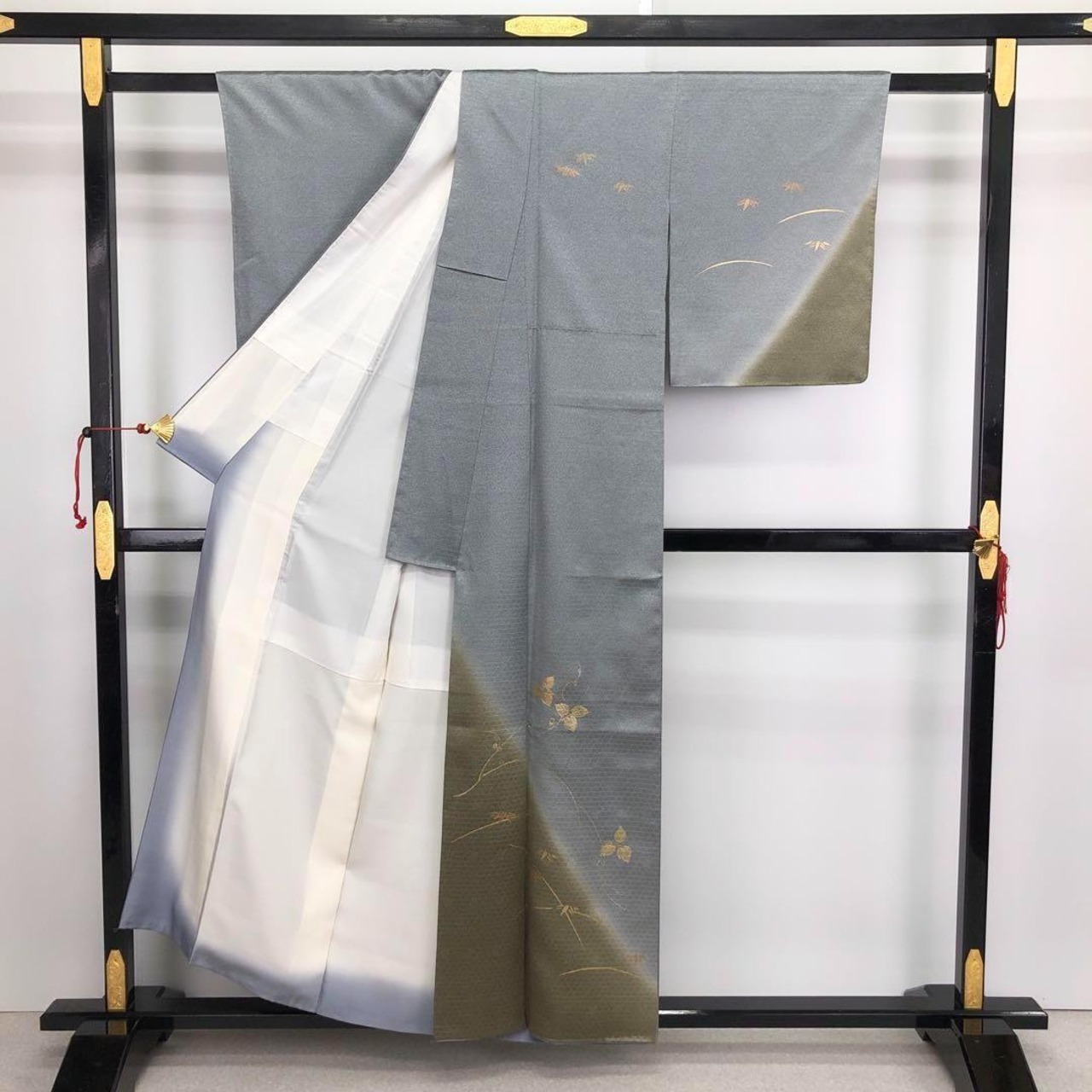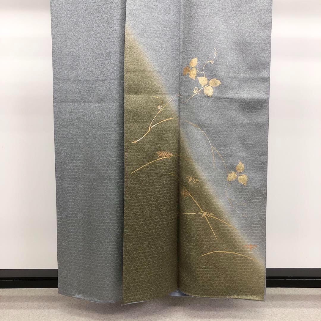 手触りの良い灰色の但馬縮緬に籠目模様に金彩を使った蔦葉模様がデザインされた素敵なお品でございます。