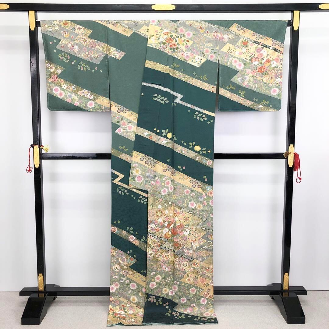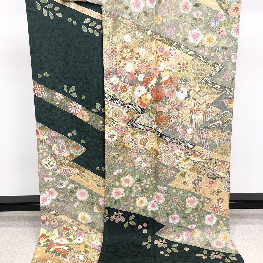 訪問着 四季の花々模様 辻が花 宝尽くし 萌葱色 トールサイズ K-3291