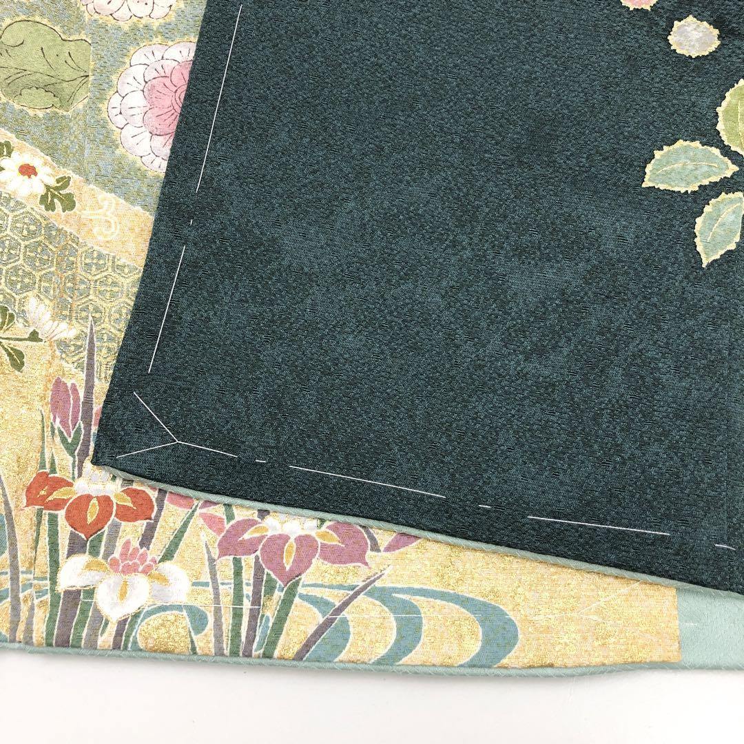 萌葱色の緑味のお色に彩り鮮やかな四季の花々模様、辻が花模様、宝尽くし、鴛鴦などの柄裄が美しくデザインされた素敵なお品でございます。