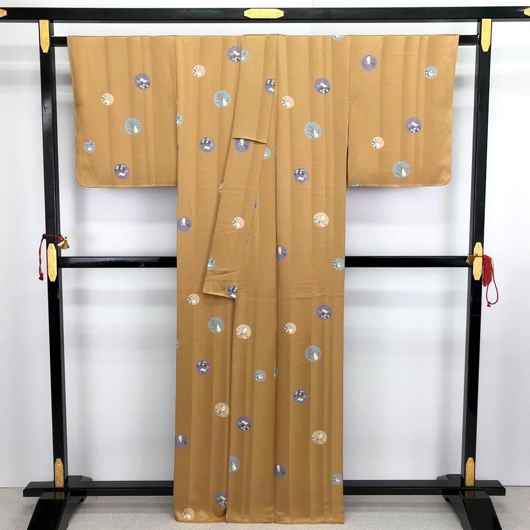 枇杷茶色の上質な縮緬地に飛び柄で丸の中に色々なうさぎの柄裄がデザインされた素敵なお品でございます。