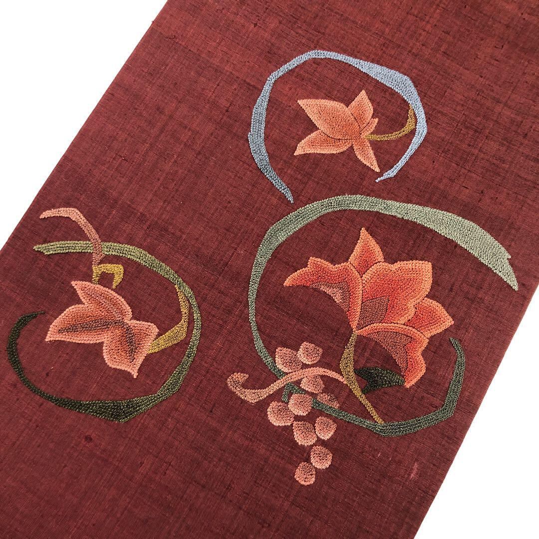 名古屋帯 紬 抽象花模様 相良刺繍 深緋色 しつけ糸 O-3124
