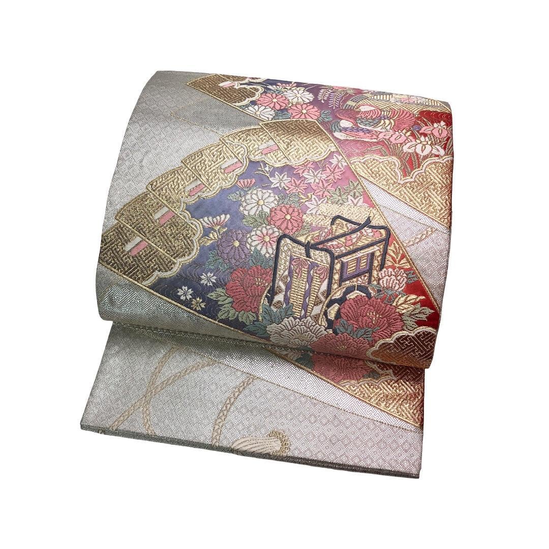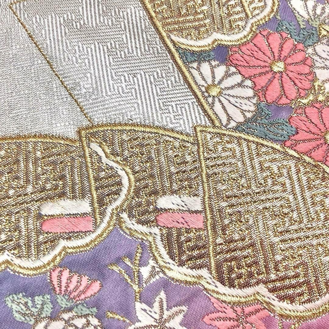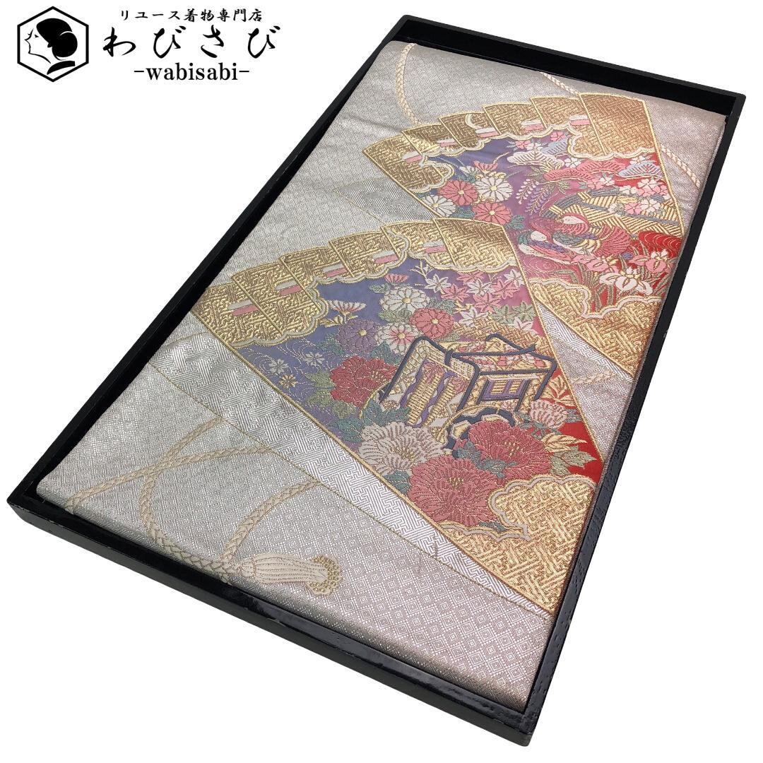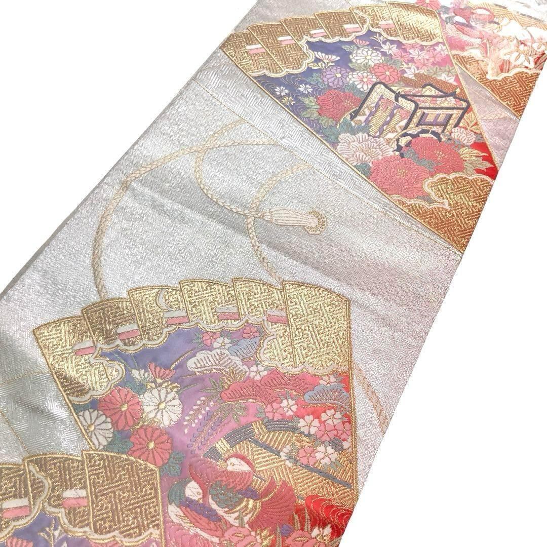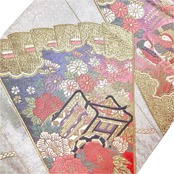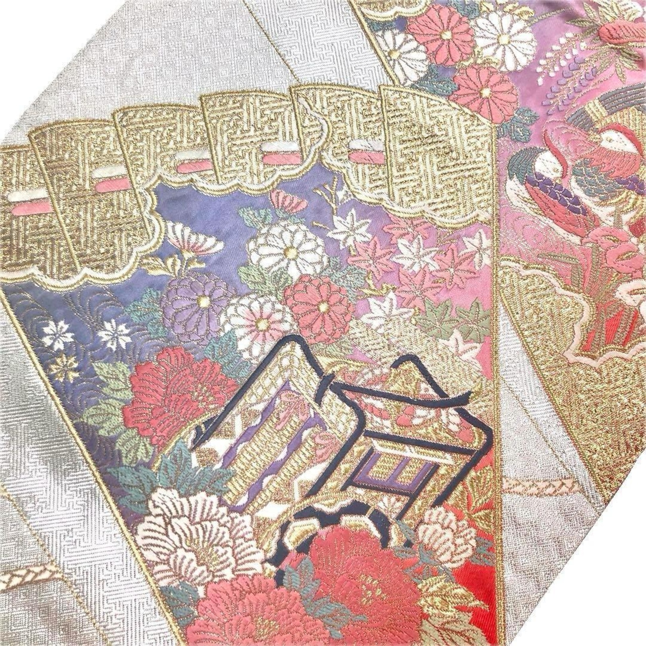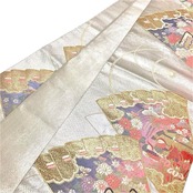 扇子の中に四季の花模様、御所車、鴛鴦、金銀糸を使った煌びやかで鮮やかな柄裄の素敵なお品でございます。