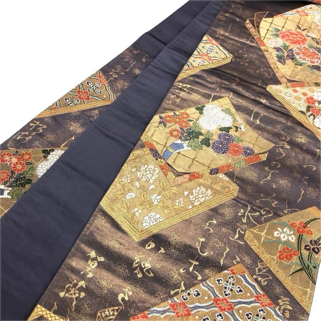 鳩羽紫色のお色味に金糸を使った煌びやかで美しい四季の花模様に文庫紋がデザインされた素敵なお品でございます。