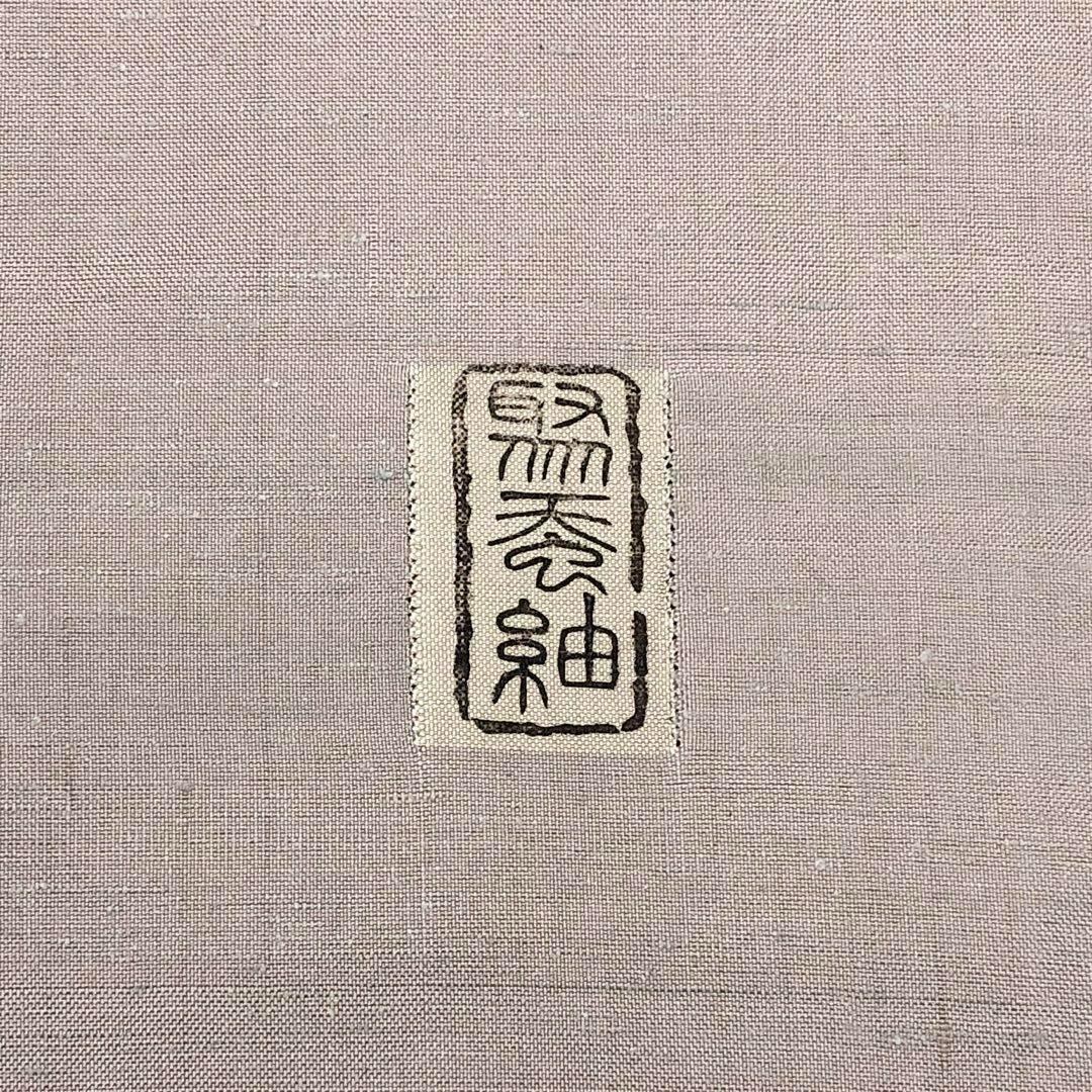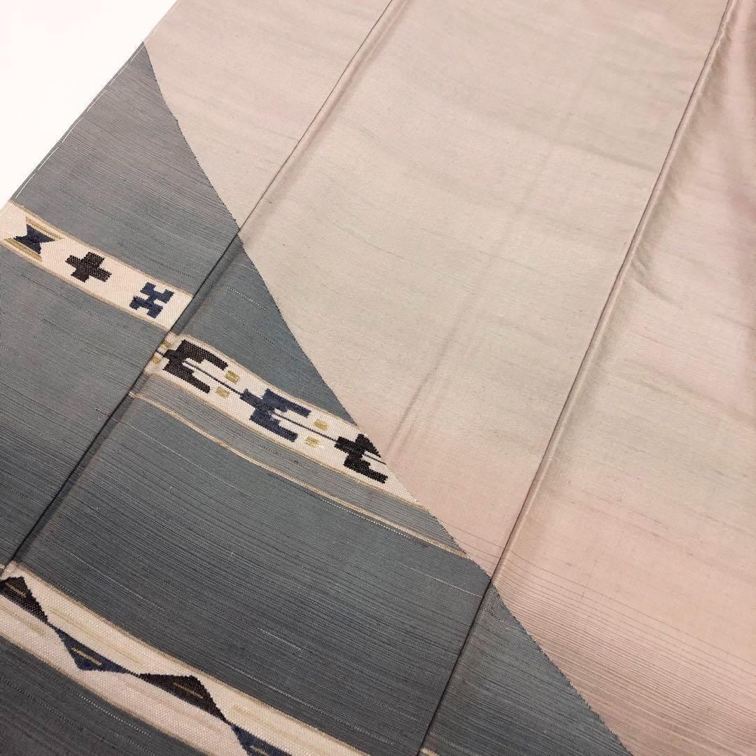 灰桜色の優しいお色味、貴重な野蚕糸を使った手触りの良い紬地に抽象模様がデザインされた素敵なお品でございます。
