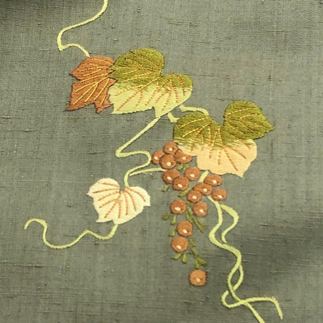 青柳鼠色の柔らかい温かみのある紬地に刺繍でデザインされた葡萄柄が素敵なお品でございます。