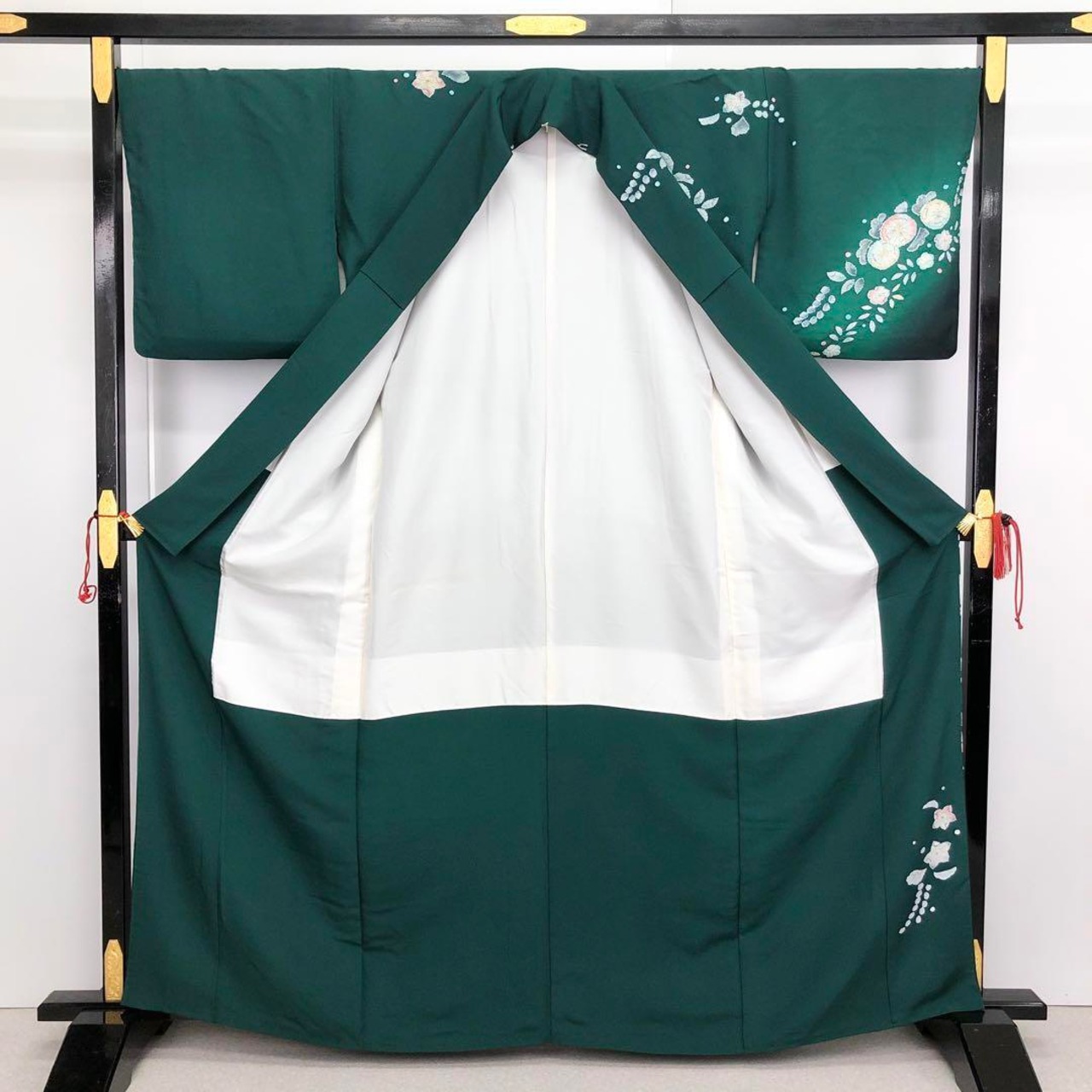 海緑色の鮮やかな緑色に美しく華やかな辻が花絞りでデザインされた素敵なお品でございます。